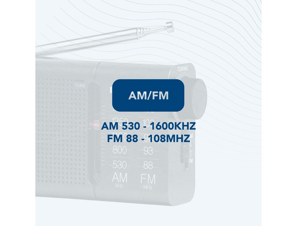 Receptor analógico clásico (AM 530-1600 kHz / FM 88-108 MHz) con altavoz frontal y salida 3,5 mm. Funciona a pilas, incorpora rueda de sintonía precisa y auriculares básicos en el set, por lo que es ideal para estudiantes que necesitan seguir emisiones educativas o exámenes de listening. Color negro.