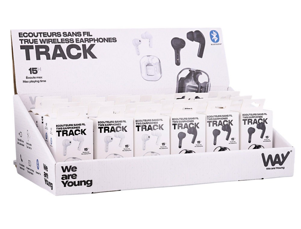 Auriculares track tws con estuche de carga expositor de 12 unidades blanco + 12 color negro