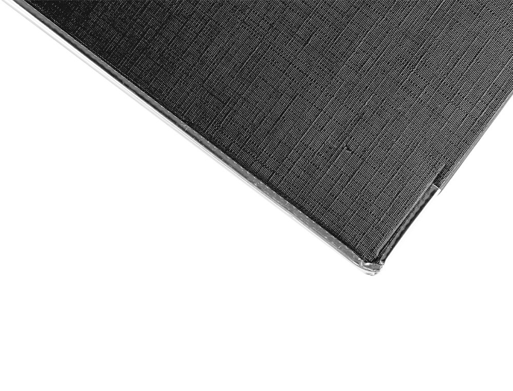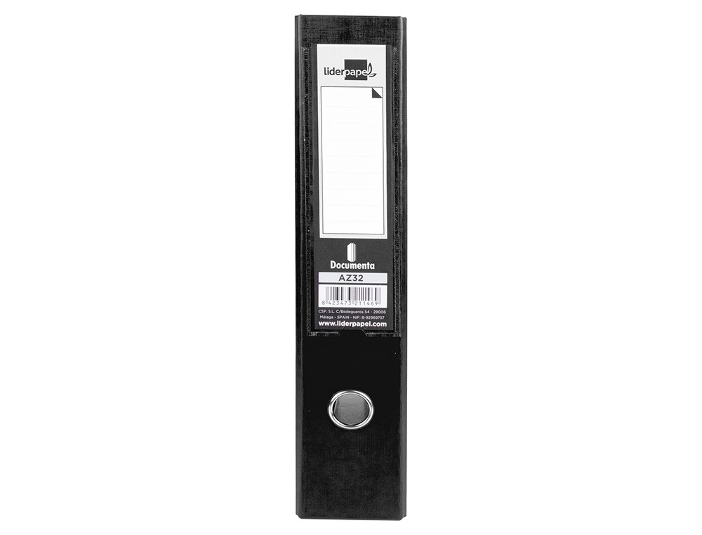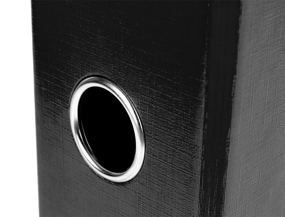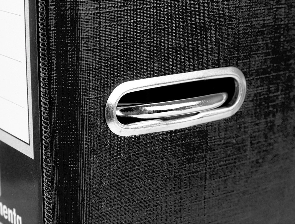 Fabricado en cartón entrecolado de 1,90 mm de espesor forrado con papel de encuadernación plastificado y gofrado con tela de PVC. Mecanismo de palanca de 75 mm con compresor metálico, cantoneras largas, ollao y tarjetero en el lomo con Rado®. Tamaño folio. Medidas exteriores del módulo: 184 mm ancho x 350 mm alto x 290 mm fondo. Ancho de lomo: 75 mm. Medidas: 280 x 345 mm.
