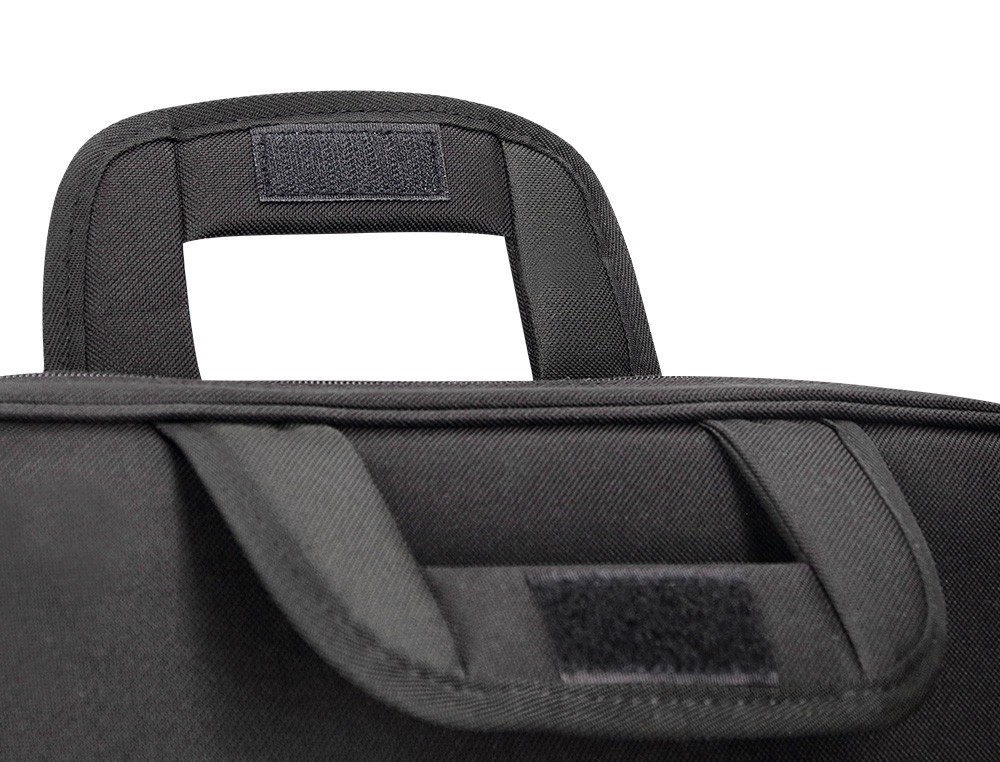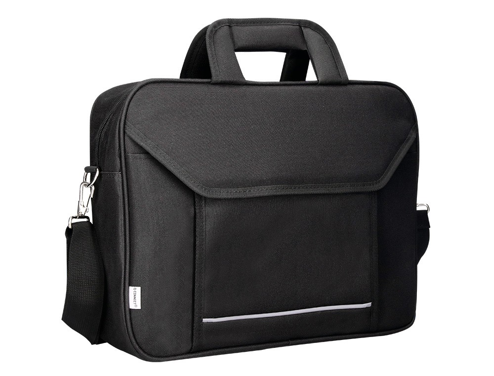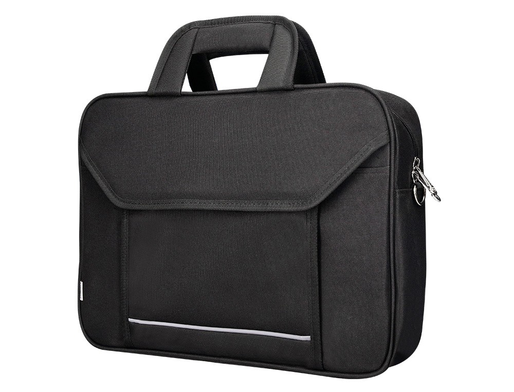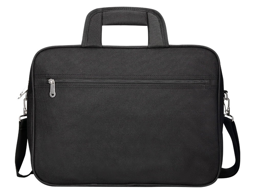Maletín para portátil práctico y ligero fabricado en poliéster. Tiene dos bolsillos exteriores, uno delantero de velcro que trae incorporados departamentos para organizar accesorios como documentos, CD, bolígrafos, etc. y otro trasero con cremallera. Posee un departamento acolchado para proteger al ordenador contra golpes con un bolsillo para los cables de electricidad. Asa de mano con velcro y de hombro. Color negro. Medidas: 390 x 290 x 90 mm.