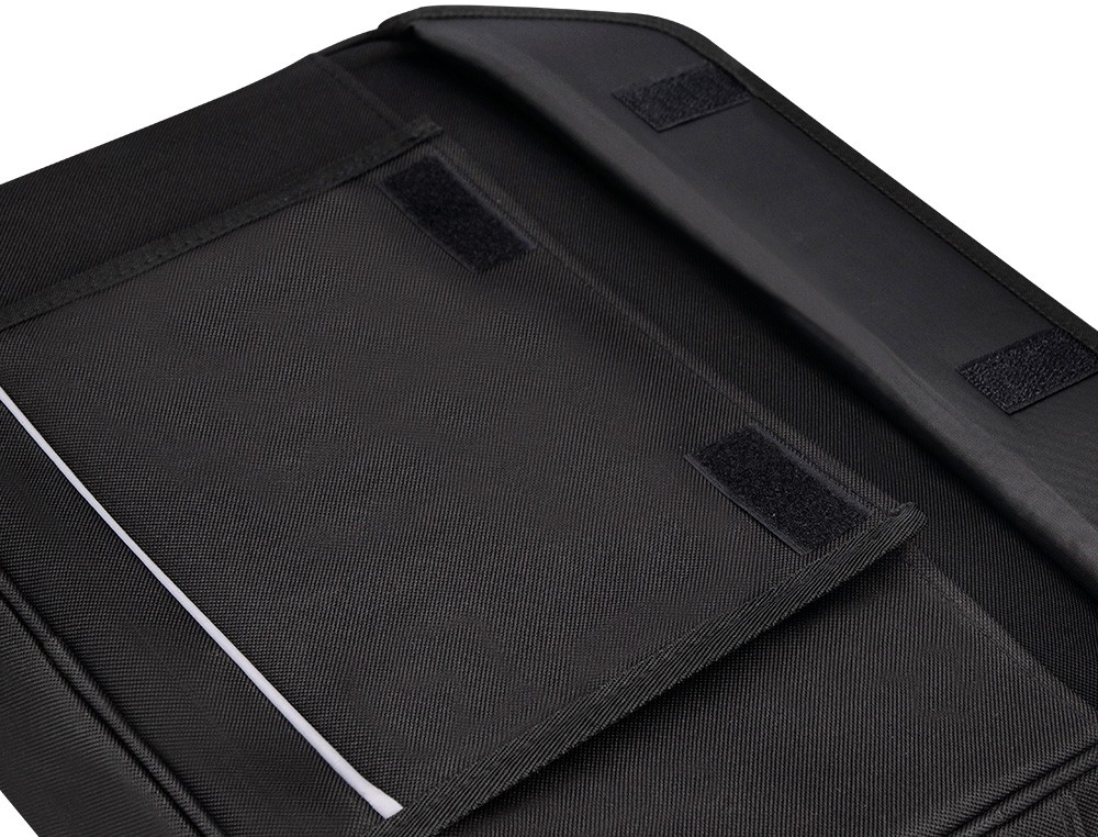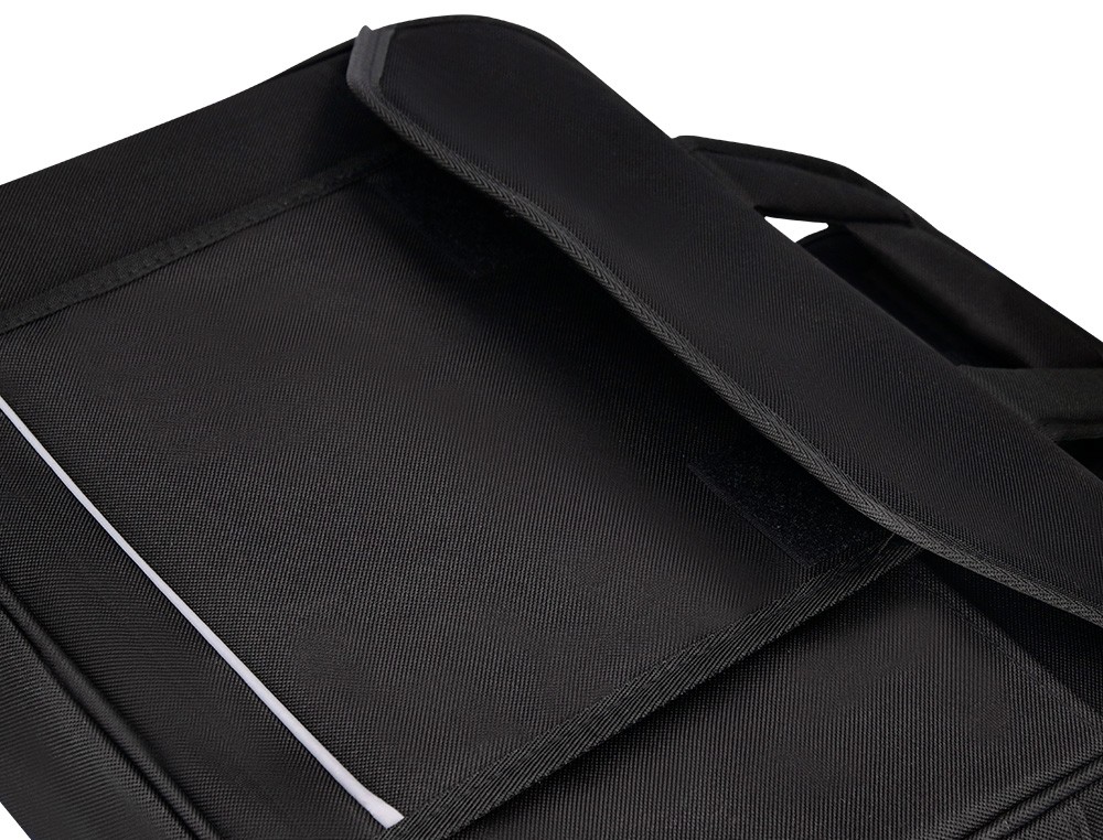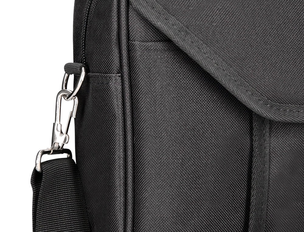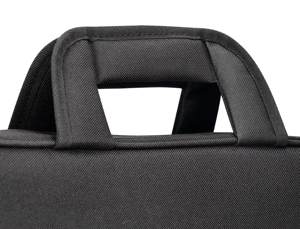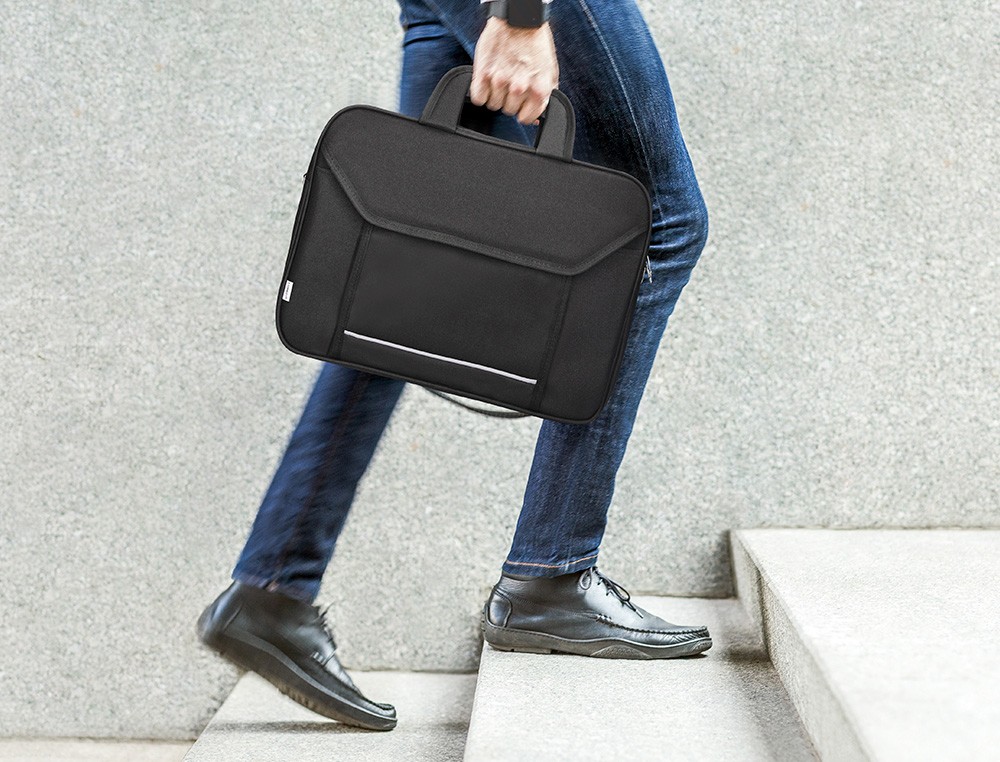 Maletín para portátil práctico y ligero fabricado en poliéster. Tiene dos bolsillos exteriores, uno delantero de velcro que trae incorporados departamentos para organizar accesorios como documentos, CD, bolígrafos, etc. y otro trasero con cremallera. Posee un departamento acolchado para proteger al ordenador contra golpes con un bolsillo para los cables de electricidad. Asa de mano con velcro y de hombro. Color negro. Medidas: 390 x 290 x 90 mm.