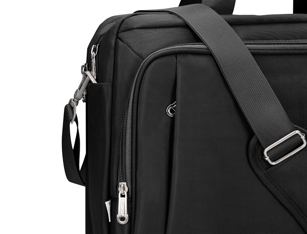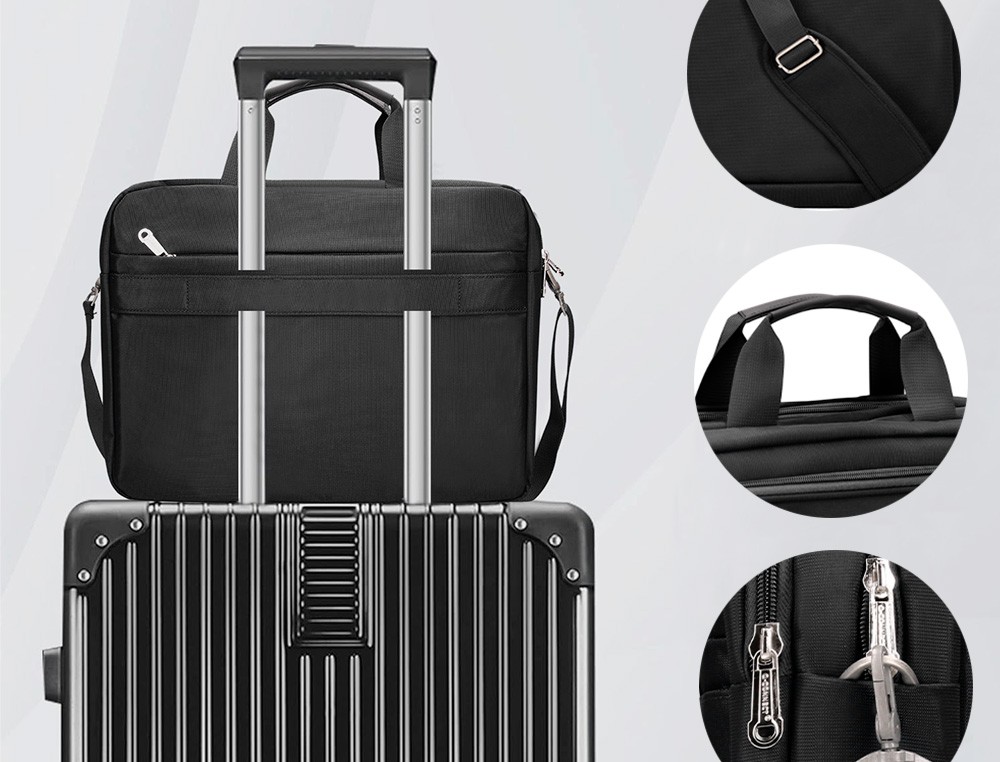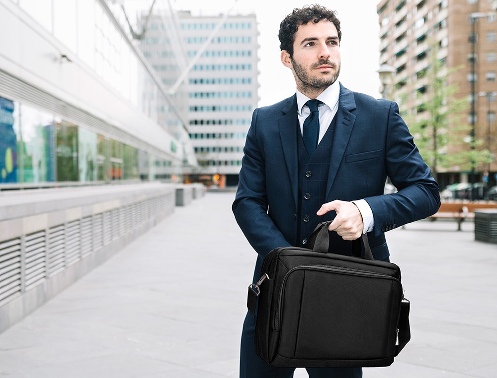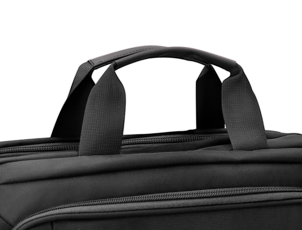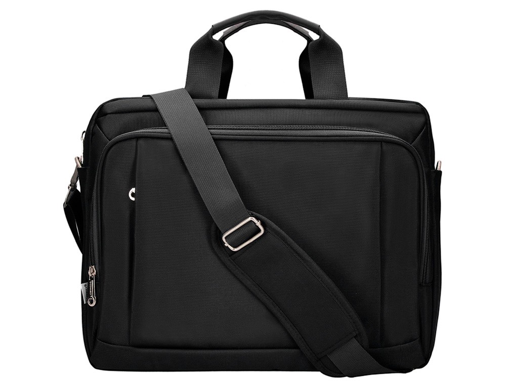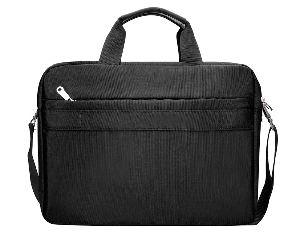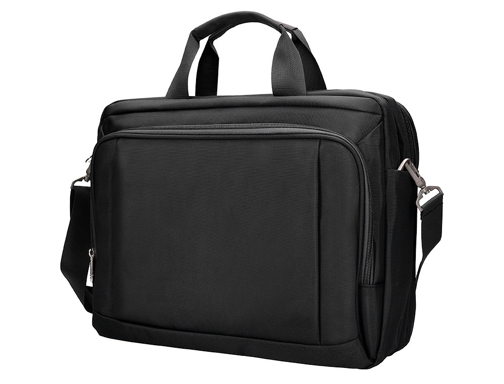 Maletín para portátil, práctico y ligero fabricado en poliéster. Tiene un bolsillo exterior con compartimento para bolígrafos y tres compartimentos interiores. Uno de los compartimentos interiores está acolchado con un cierre de velcro para el portátil. 1 asa de mano. Medidas: 390 x 310 x 120 mm.