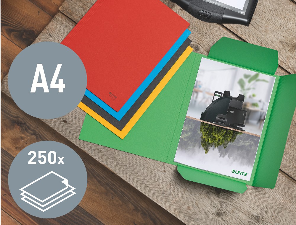 SUBCARPETA DE 3 SOLAPAS DE CALIDAD SUPERIOR Y LLAMATIVA. UNO DE LOS TIPOS DE SUBCARPETA MÁS UTILIZADAS PARA LA PROTECCIÓN Y EL TRANPORTE DE DOCUMENTOS. CON SOLAPAS INTERIORES PARA EVITAR QUE LOS DOCUMENTOS SE SALGAN. FABRICADA CON CARTÓN 100% RECICLADO, NEUTRO PARA EL CLIMA GRACIAS A LA REDUCCIÓN Y COMPENSACIÓN DE CO2, 100% RECICLABLE Y CON CERTIFICACIÓN MEDIOAMBIENTAL BLUE ANGEL. ESTA ROBUSTA Y PRÁCTICA CARPETA COMPLEMENTA PERFECTAMENTE OTROS PRODUCTOS DE LA GAMA LEITZ RECYCLE Y ESTÁ HECHA PARA DURAR. PRODUCTO DE PAPELERÍA ECOLÓGICA, MODERNO Y CONTEMPORÁNEO QUE QUEDARÁ GENIAL EN CASA Y EN LA OFICINA. CON LA GAMA ECOLÓGICA RECYCLE DE LEITZ PUEDES MEJORAR TANTO EL ENTORNO DE TU OFICINA COMO EL MEDIO AMBIENTE DE NUESTRO PLANETA.