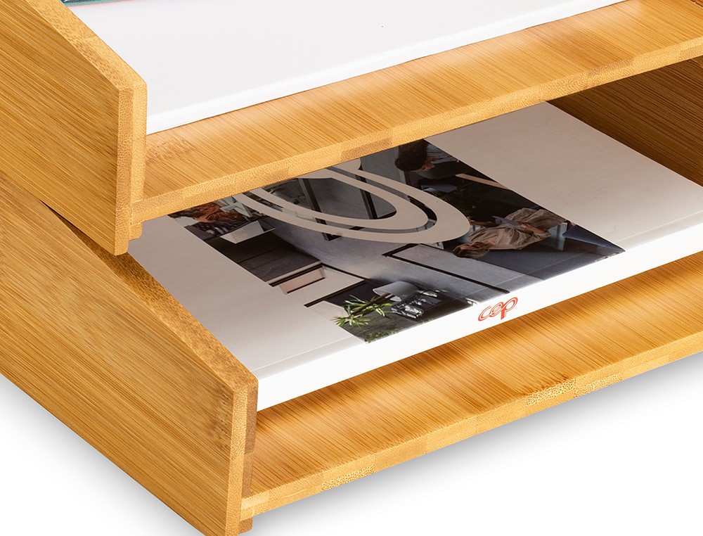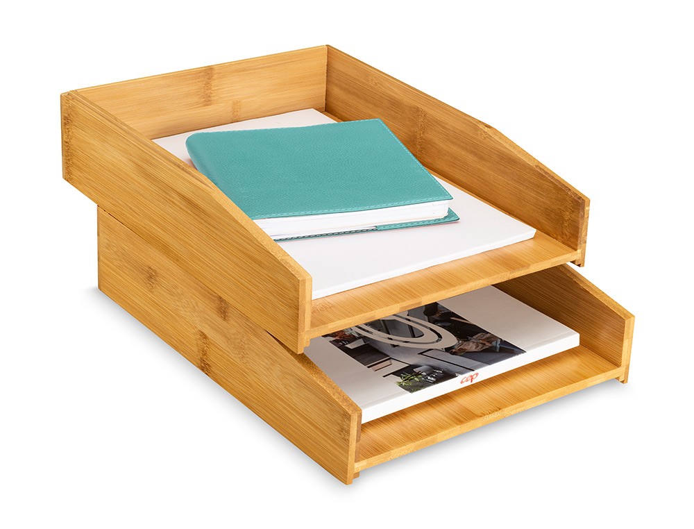 Ideal para el teletrabajo o en la oficina para un archivo rápido y eficaz.Diseño elegante y escandinavo para un ambiente agradable. Apilamiento ver tical o en escalera. Una de las dos bandejas está equipada con almohadillas antideslizantes para proteger su espacio de trabajo. El barniz protectorhace que el producto sea impermeable. No contiene clavos ni tornillos. Ma terial: Bambú 100% natural. Medidas: 34 x 25,2 x 7,5 cm. Peso: 1,8 kg. Reciclable. Tenga en cuenta que los productos de bambú pueden presentar comúnmente diferencias naturales en los tonos de color.