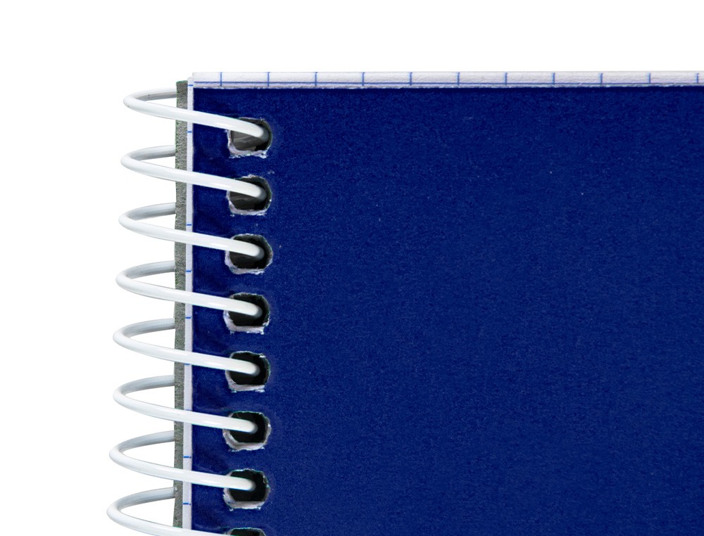 Tapa de cartoncillo de 400 g/m² impresa y plastificada en polietileno brillo. Contratapa de cartoncillo de 400 g/m². 80 hojas. Papel de 60 g/m². Espiral nylonizada blanca. Sin margen. Cuadrícula de 4 mm. Colores surtidos.