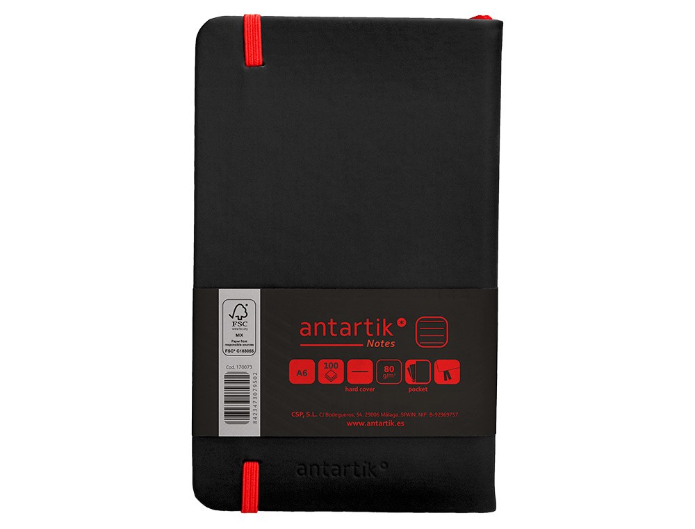 Cuaderno con gomilla antartik notes tapa dura a6 hojas rayas negro y rojo 100 hojas 80 gr fsc
