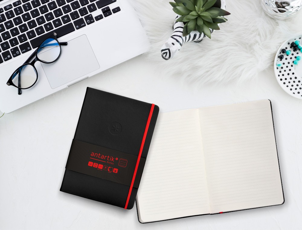 Cuaderno con gomilla antartik notes tapa dura a5 hojas rayas negro y rojo 100 hojas 80 gr fsc