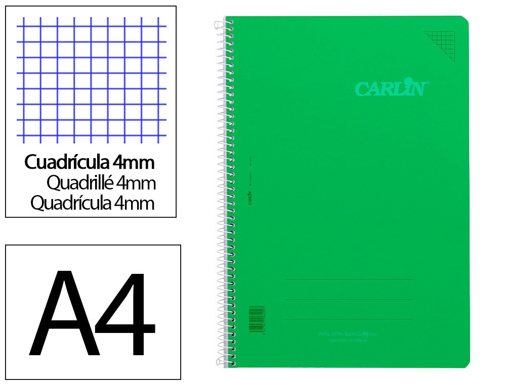 Cuaderno espiral carlin a4 tapa plastico 80h 90gr cuadro 4mm con margen color verde