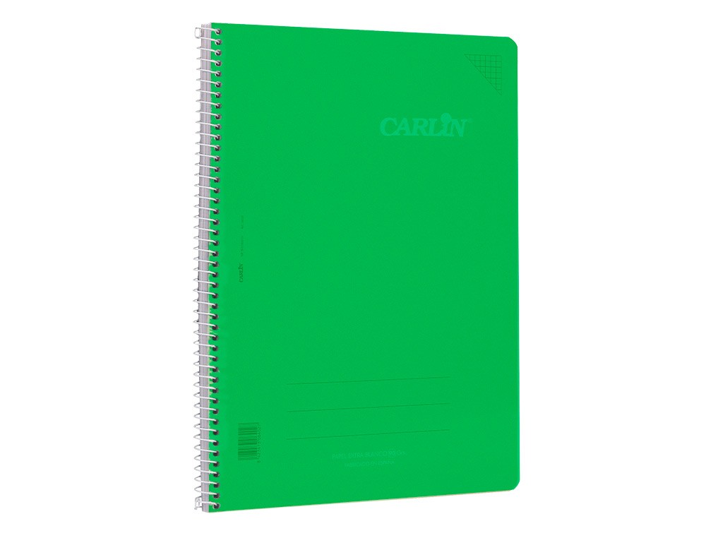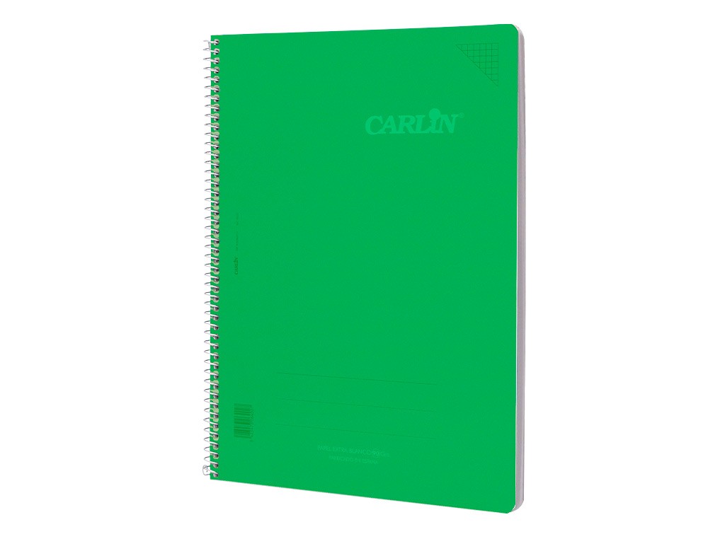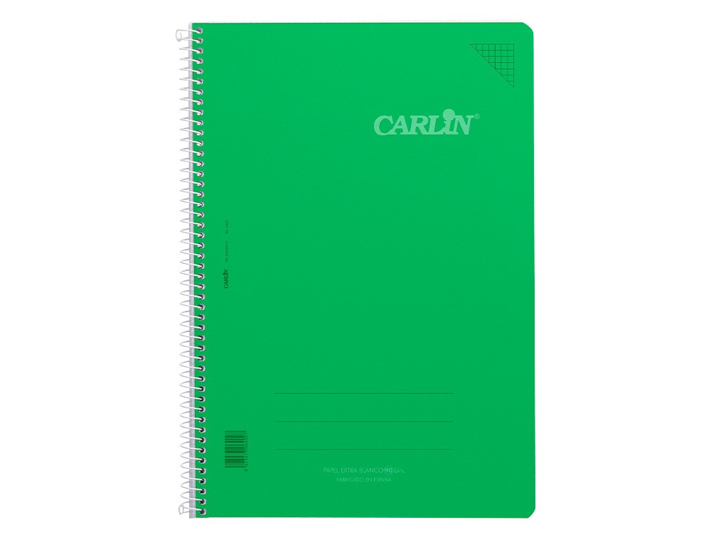 Cuaderno espiral Carlin con tapa y contratapa de plastico resistente. DinA4. 80 hojas. 90gr. La tinta no traspasa. Cuadro 4 mm con margen. Espiral nylonizada y coil-lock. Color verde.