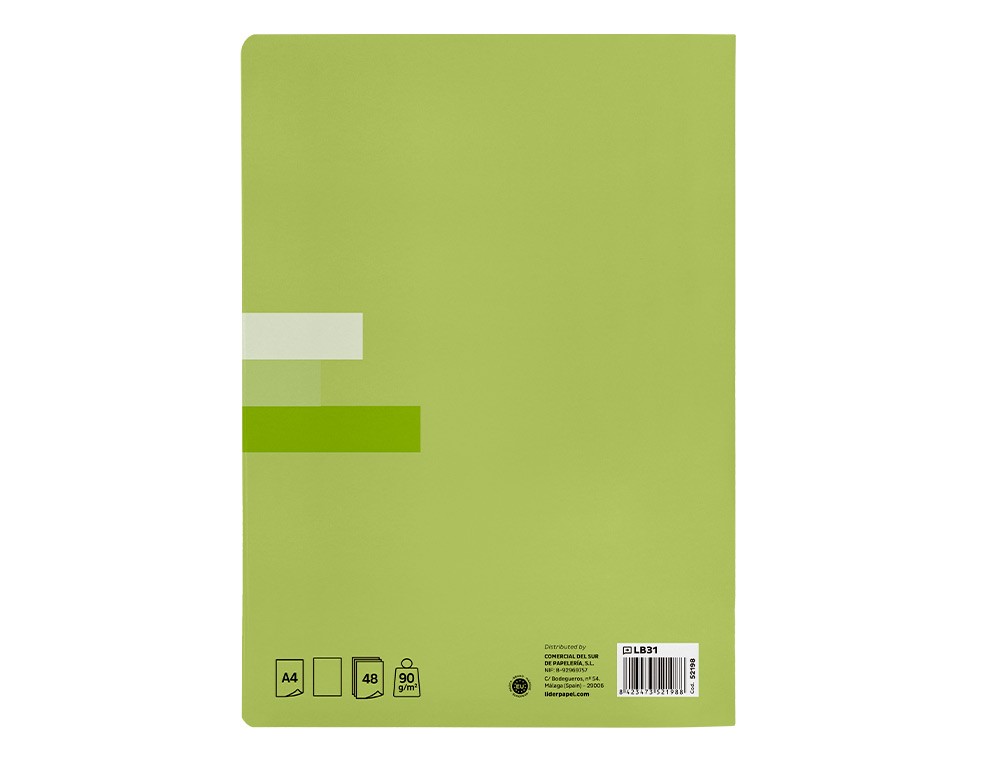 Tapa de papel estucado de 270 g/m² y plastificado brillo. 48 hojas. Papel 90 g/m² de óptima calidad. Muy resistente. No traspasa la tinta. Con margen. Colores surtidos.