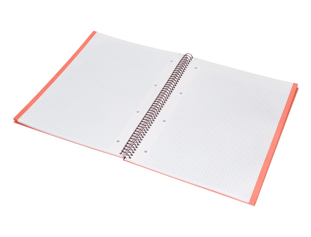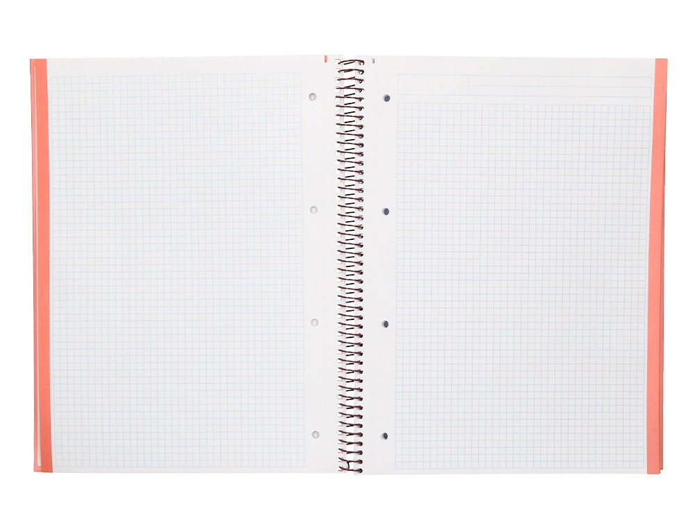 CUADERNO A4 MICROPERFORADO DE GRAN CALIDAD, CUADRO DE 5MM CON BANDA DE COLOR, 80 HOJAS DE PAPEL 80G/M2 CON EXCELENTES CARACTERÍSTICAS, GRAN SUAVIDAD Y BLANCURA, ADEMÁS HACE LA ESCRITURA MUY FLUIDA. TAPA DE CARTÓN ENTRECOLADO DE 1,5 MM DE ESPESOR. TAPA FORRADA A UNA CARA CON PAPEL ESTUCADO MATE EXTRASUAVE. GUARDA INTERIOR IMPRESA. GRAN RESISTENCIA Y RIGIDEZ. LA TINTA NO TRASPASA. ESPIRAL NYLONIZADA Y BANDA DE COLOR DEL MISMO COLOR QUE LA TAPA. COIL-LOCK.