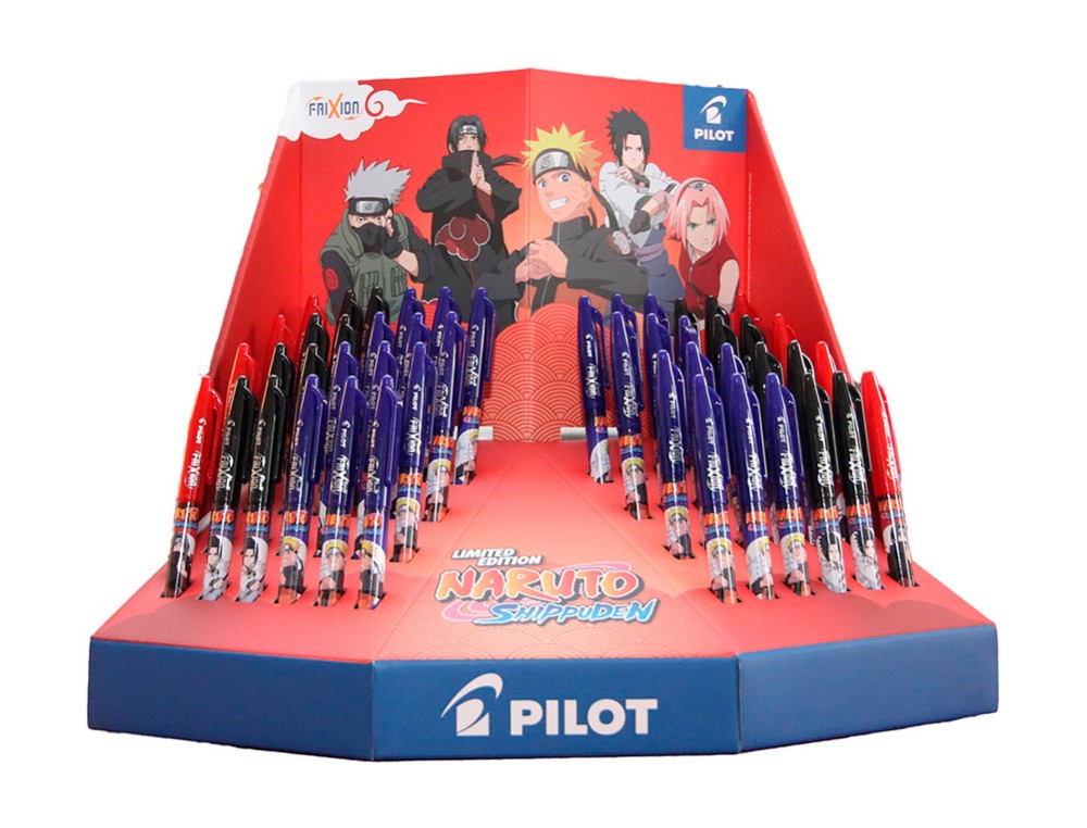 Expositor bolígrafos Pilot Frixion Naruto Edicion Limitada. Contiene 48 unidades (12 Frixion Ball azules, 6 negros y 6 rojos y 12 Frixion Clicker azules, 6 negros y 6 rojos). Borrables y recargables.