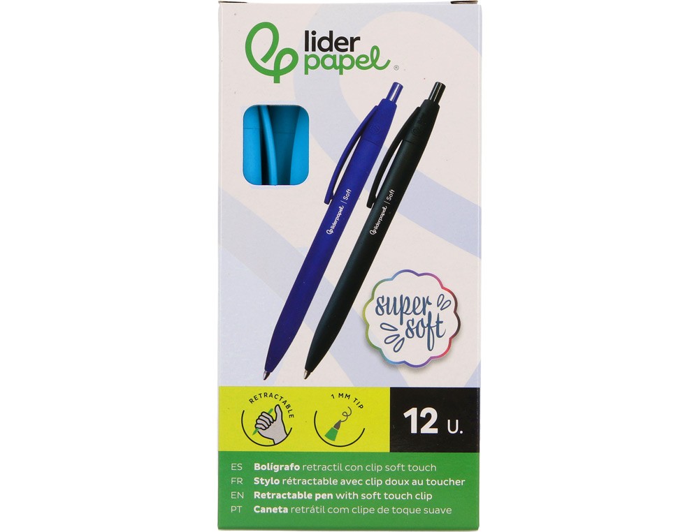 Boligrafo liderpapel punta 1 mm retractil con clip acabado soft touch tinta azul cuerpo azul cielo