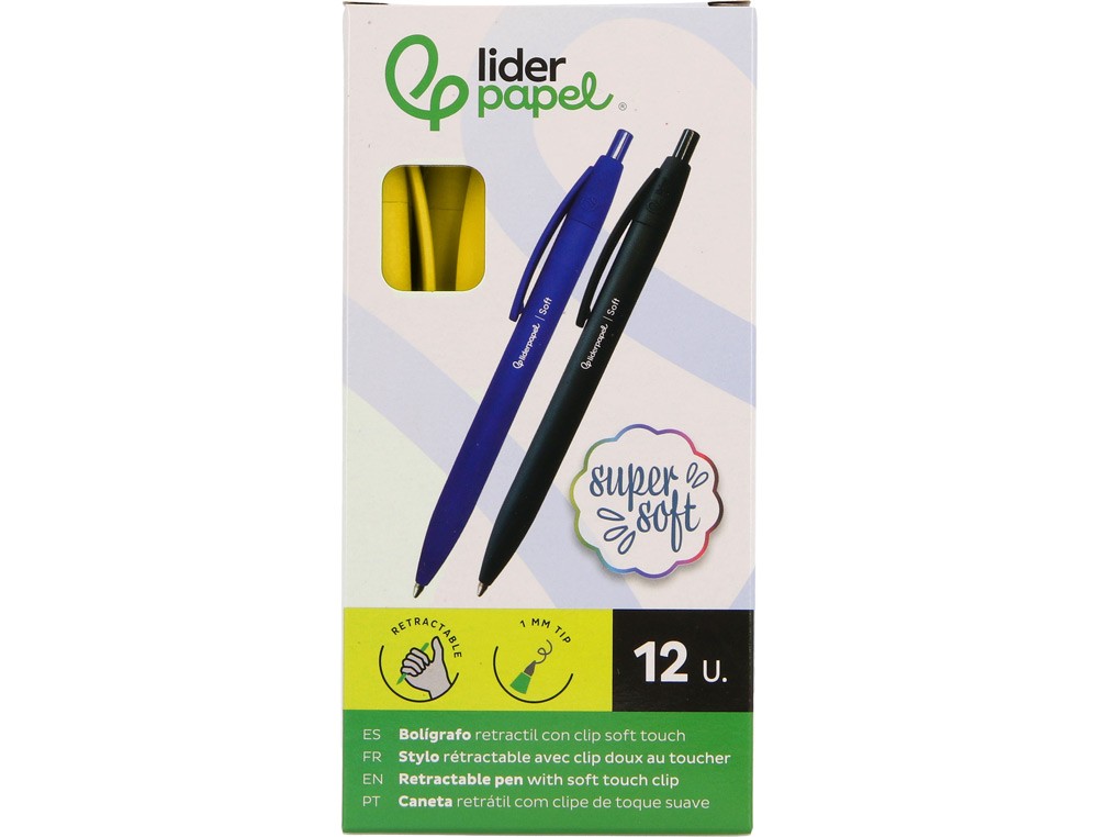 Boligrafo liderpapel punta 1 mm retractil con clip acabado soft touch tinta azul cuerpo amarillo