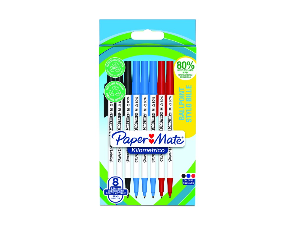 Bolígrafos Paper Mate Kilométrico. Escritura Larga con punta mediana (1,0 mm). Tinta negra, azul y roja. 80% plástico reciclado. 8 unidades. Fabricados en un 80% con plásticos reciclados, los bolígrafos Paper Mate Kilométrico ofrecen una escritura fiable y suave y son ideales para todo tipo de situaciones de escritura. Disponibles en tinta negra, azul y roja con una punta mediana de 1,0 mm, la tinta fuerte destaca para causar una impresión firme y profesional.