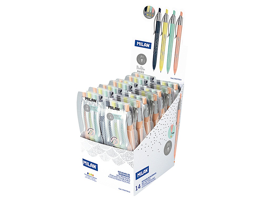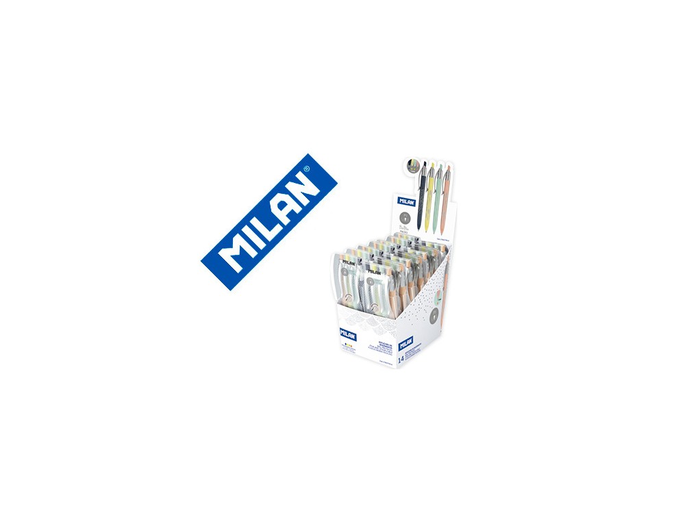 Boligrafo milan p1 silver expositor de 14 unidades retractil 1 mm estuche de 4 unidades colores surtidos