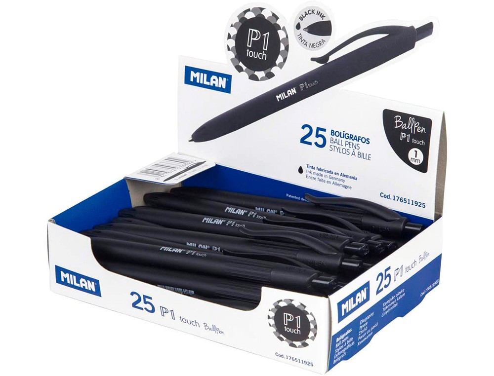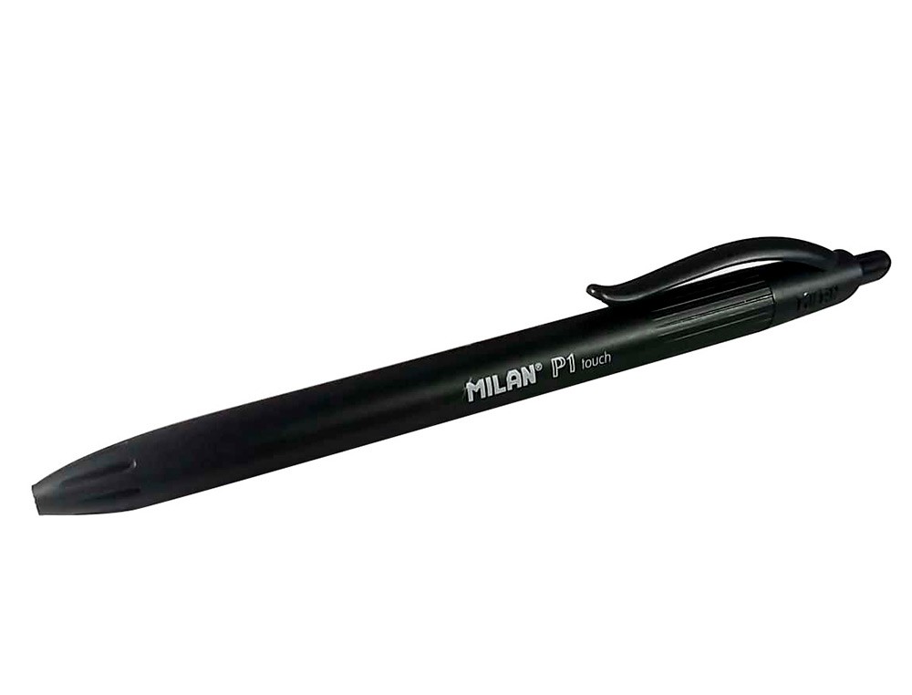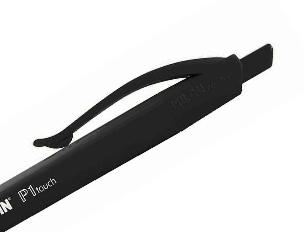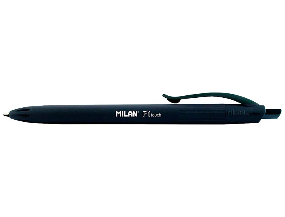 Bolígrafo P1 touch negro, con el cuerpo del mismo color que la tinta. Longitud de escritura aproximada de 1.200 metros. Punta 1 mm. Tinta fabricada en Alemania. Diseño original creado por el departamento de I+D de MILAN. Medidas bolígrafo: 14,1 x 1,7 cm. 1 cm Ø.