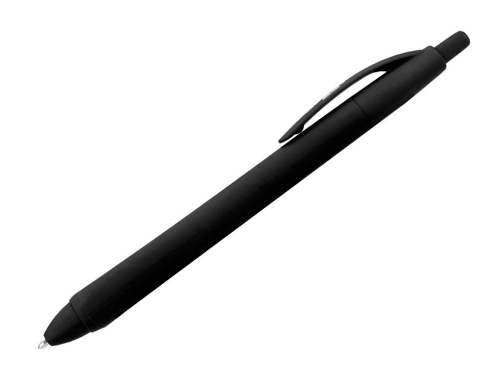 Bolígrafo retráctil con cuerpo efecto goma. Tinta a base de aceite. Cuerpo del color de la tinta. Punta media. Trazo de 1 mm.
