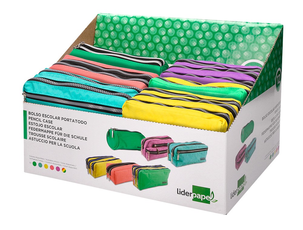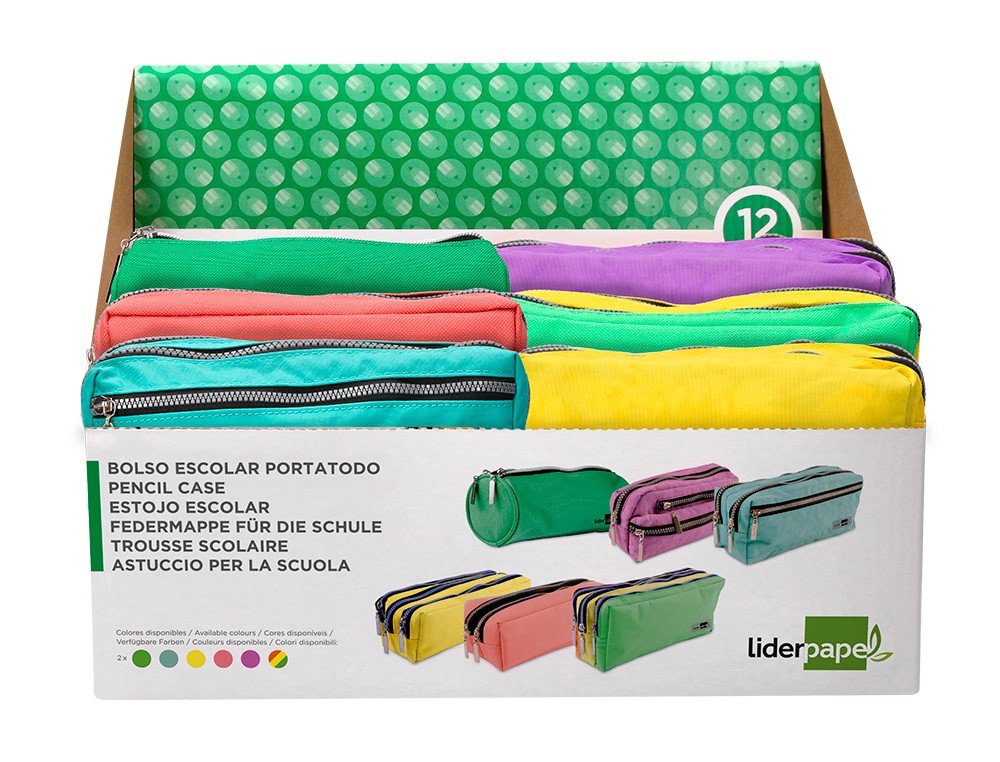 BOLSO ESCOLAR LIDERPAPEL PORTATODO EXPOSITOR DE 12 UNIDADES COLORES Y MODELOS SURTIDOS