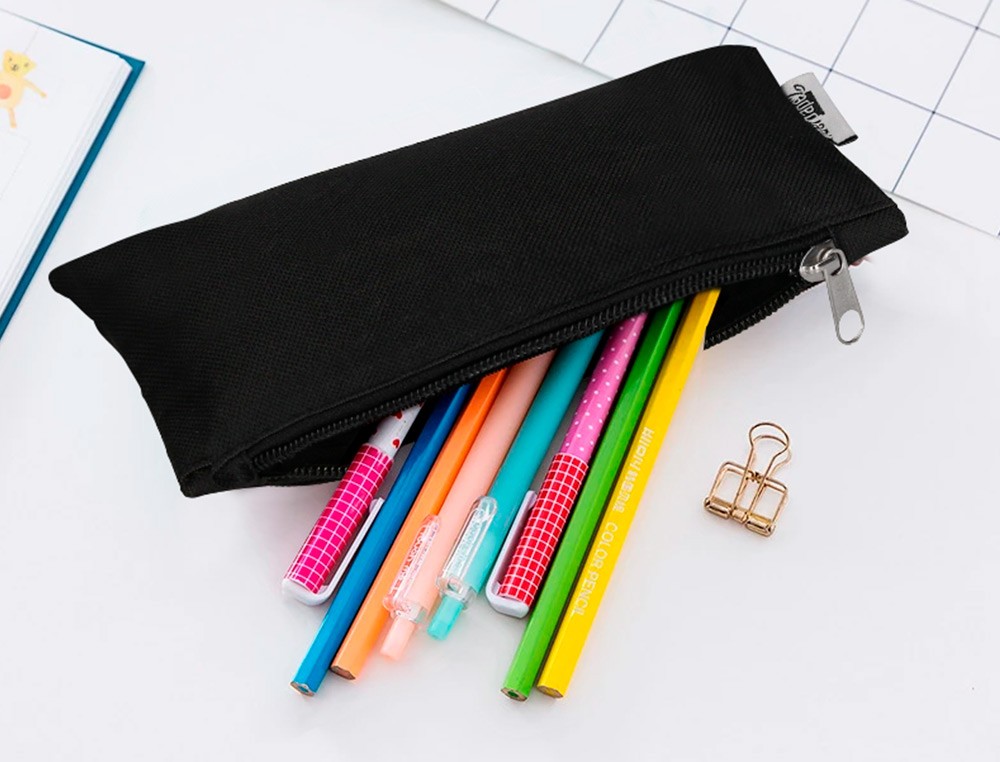 Estuche portatodo escolar con un departamento cerrado con cremallera, ideal para guardar el material escolar de uso diario: bolígrafos, portaminas, gomas, sacapuntas, etc. Diferentes colores y medidas.