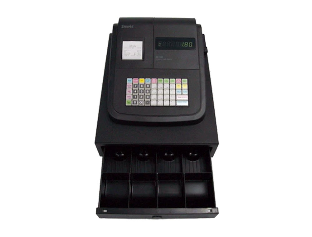Registradora sam4s er-180u 16 departamentos 4 empleados visor led cajon pequeño color negro 330x420x210 mm
