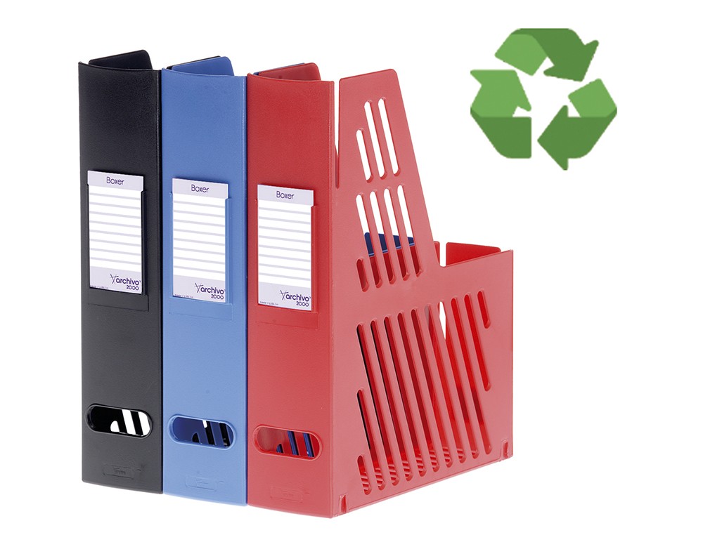 Cajetín de archivo sostenible Archivo 2000 con tarjetero identificador. Fabricado en poliestireno 100% reciclado y reciclable. Lomo ollado de 75 mm. Gran capacidad y estabilidad, permiten mantener la documentación bien organizada y siempre a mano. Formato A4 y folio. Color negro. Medidas exteriores: 240x75x315 mm. Fabricado en España.