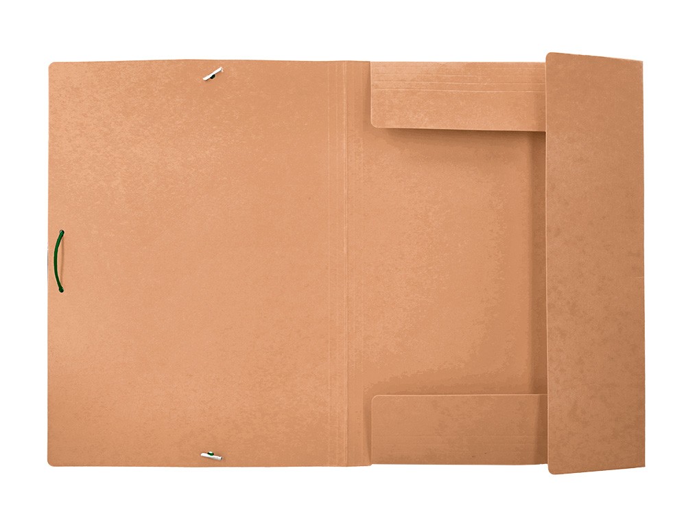 Carpeta de gomas fabricada en cartulina kraft marrón de 400 g/m². 100% reciclada. Con 3 solapas. Formato DIN A4+.