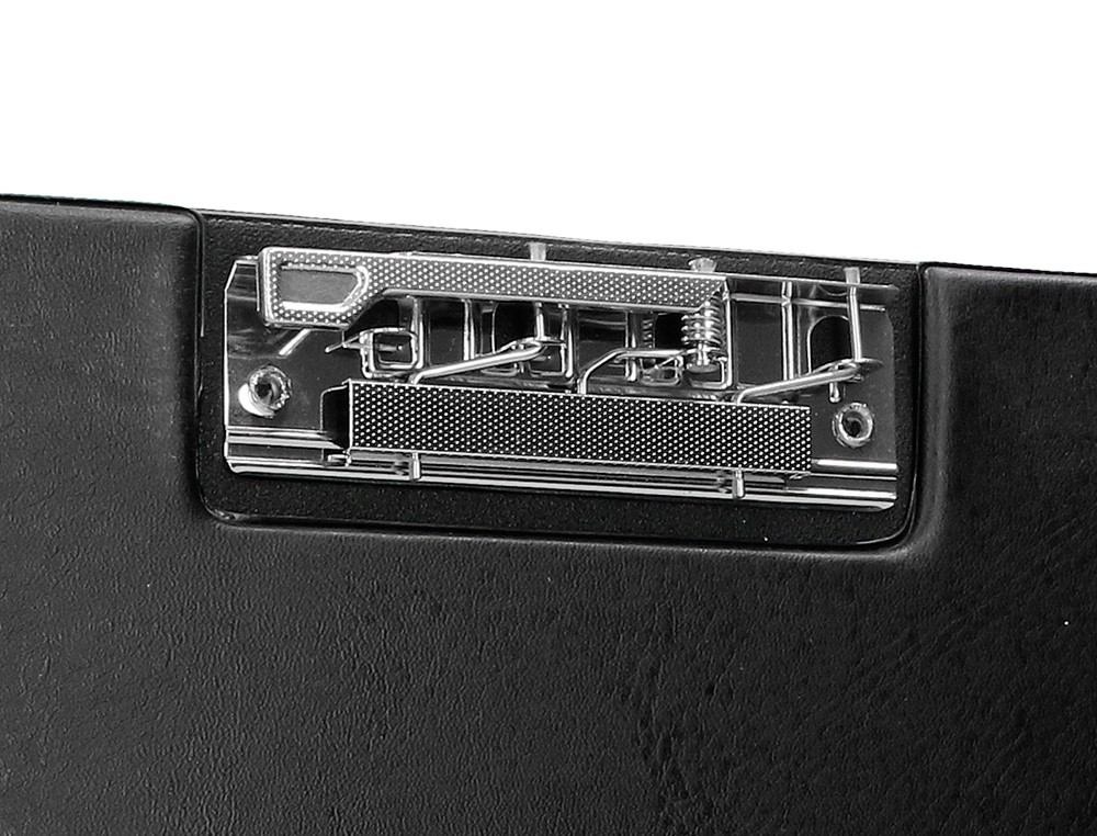 Portanotas de cartón forrado en plástico soldado. Con tapa y pinza disponible en la parte superior o interior lateral, con pinza de gran resistencia. Tamaño folio.