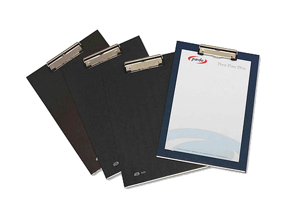 Fabricado en cartón forrado en PVC. Con pinza metálica. Tamaño folio.