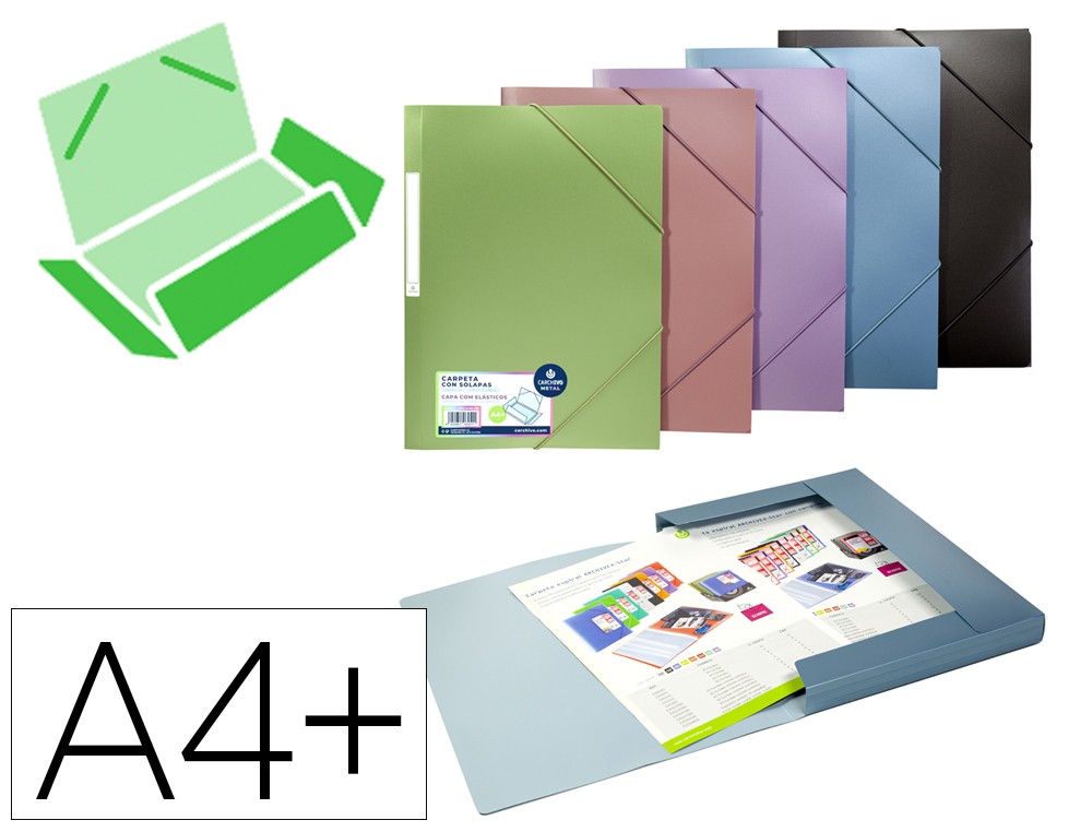 Carpeta carchivo gomas polipropileno tres solapas color metalizado expositor de 30 unidades colores surtidos