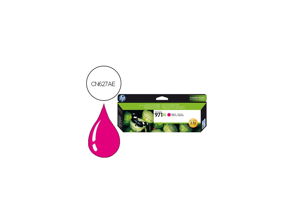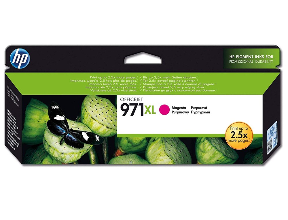 Ideal para impresión consistente y asequible de documentos en color de calidad profesional duraderos de cartuchos que son fáciles de instalar y con reciclaje gratuito. El cartucho de tinta magenta HP 971XL Officejet produce documentos en color de calidad profesional con gran rentabilidad, a la vez que permite ahorrar tiempo a los grupos de trabajo creando impresiones consistentes y duraderas.