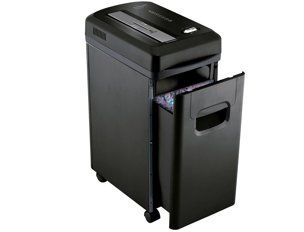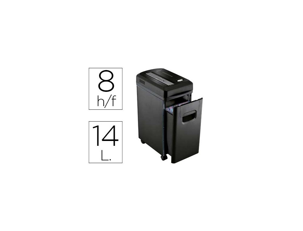 Capacidad de corte: 8 hojas. Microcorte en partículas de 3,3 x 9 mm. Nivel de seguridad P-5. Ancho de entrada: 220 mm. Arranque y parada automáticos. Marcha atrás para eliminar atascos. Protección contra sobrecalentamiento. Destruye grapas, clips y tarjetas de crédito. Con ruedas para un mejor desplazamiento. Papelera de 15 litros. Medidas: 350 x 484 x 215 mm. Peso: 8,22 kg.
