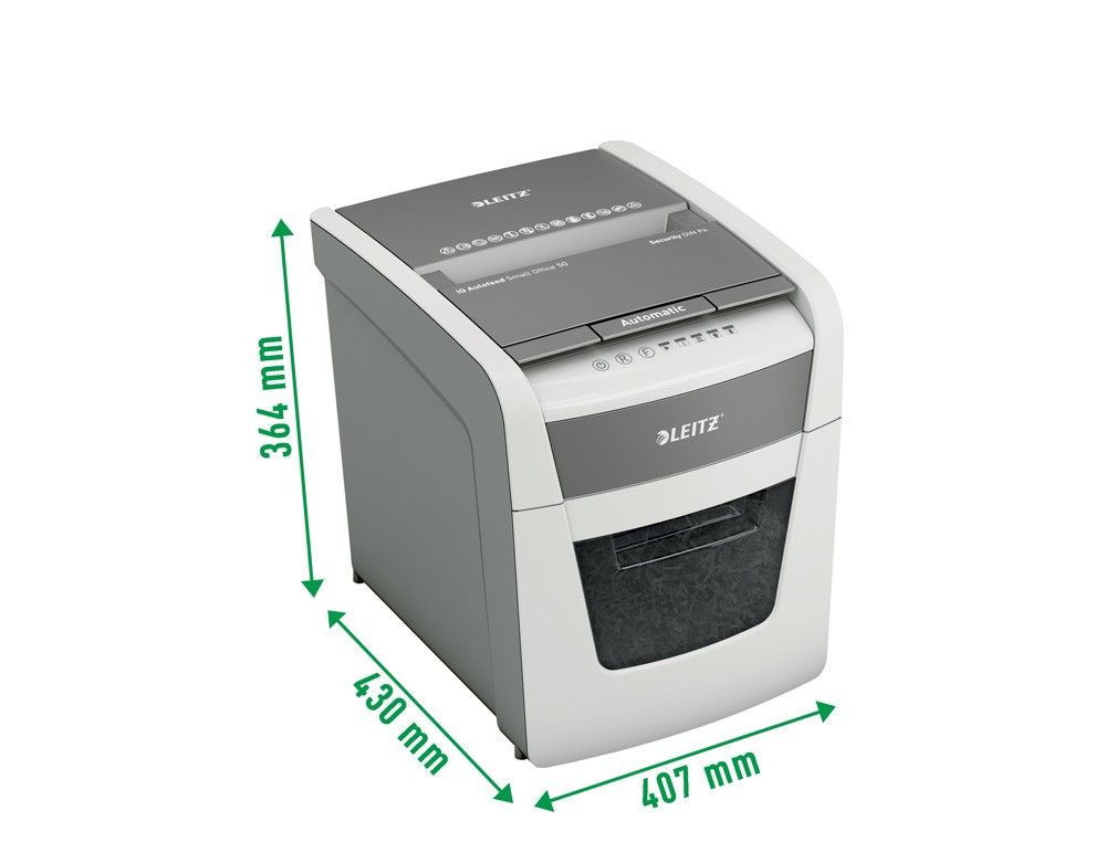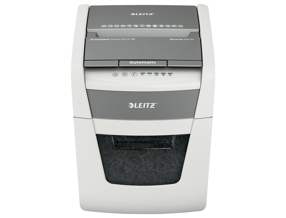 Destructora automática para pequeña oficina Leitz IQ Autofeed 50X P4. Destructora de papel totalmente automática de Leitz. Tan inteligente que funciona silenciosamente por sí sola, simplemente inserta tu pila de papeles (incluyendo grapas y clips), cierra la tapa y continúa con tu día. Ideal para una oficina pequeña o para la oficina en casa. Seguridad confidencial y excelente rendimiento con esta destructora anti atasco, silenciosa y de larga duración (10 minutos) con alimentación automática. Destruye automáticamente 50 hojas A4 en partículas de seguridad P4 (4x28mm) cortadas de una sola vez en la compacta papelera de 20L. Manejo sencillo mediante controles táctiles.