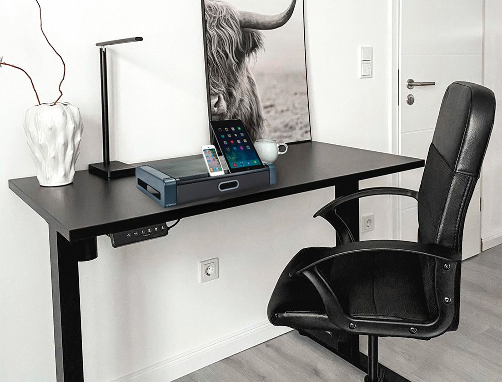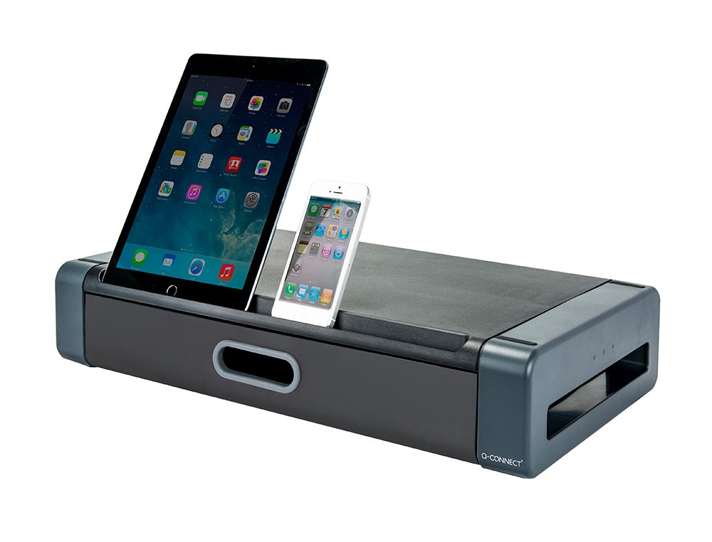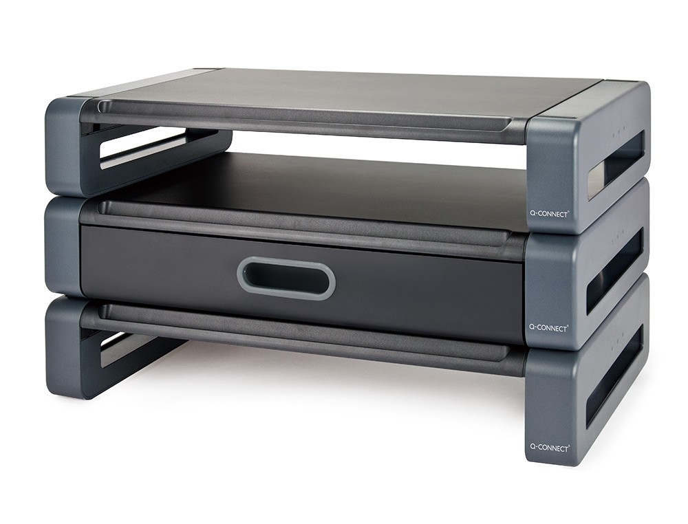 Soporte de monitor amplio y resistente. Con cajón para organizar los artículos esenciales de oficina. Ajusta la pantalla para evitar las tensiones en el cuello. Medidas: 486 x 96 x 276 mm. Peso: 1,9 kg.