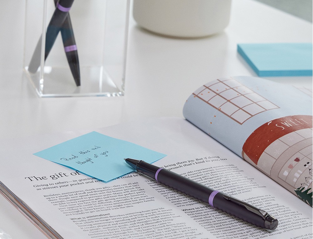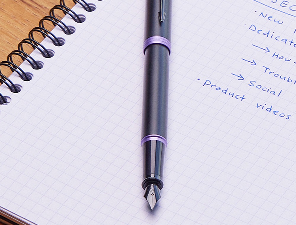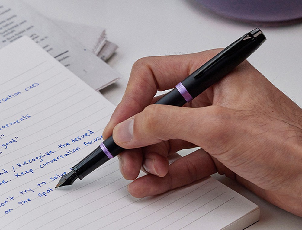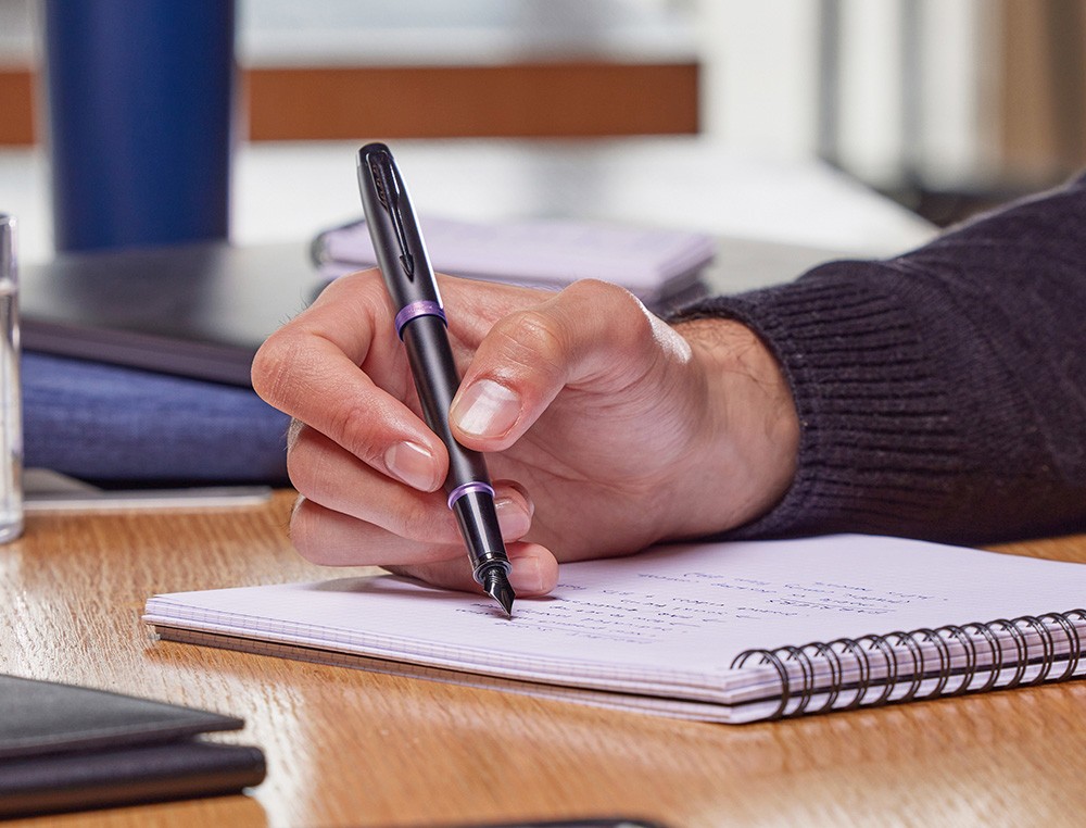 Pluma estilográfica Parker con acabado en laca negra satinada sobre acero inoxidable y llamativos detalles en morado brillante. Diseñada pensando enel profesional moderno, la pluma estilográfica Vibrant Rings de Parker IM es funcional, refinada, y destacará sin duda en cualquier lugar. Al combi nar acabados minimalistas y elegantes completamente negros con detalles llamativos y vibrantes, esta pluma estilográfica de lujo sabe cómo causar una excelente primera impresión con un estilo discreto. Con más de un siglo de experiencia y artesanía propia, Parker proporciona a esta colección unas piezas metalizadas exclusivas adornadas con un revestimiento de PVD, queofrece una resistencia superior al desgaste y la corrosión, así como un l n look distintivo. Plumín fino de acero inoxidable, muy duradero y fiable,que proporciona una experiencia de escritura cómoda y personal. Esta mod erna pluma estilográfica usa cartuchos de tinta Quink o frasco de tinta desponibles en diferentes colores, para