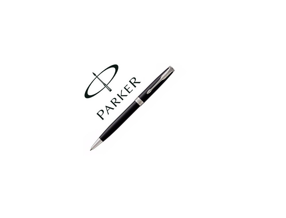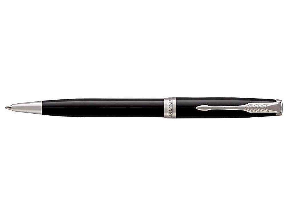 Bolígrafo de metal lacado en resina negra brillante. Adornos de cromo y anillo con imagen de marca. Acabado con un clip en forma de flecha en acero inoxidable. Mecanismo de giro. Presentación en estuche de regalo.
