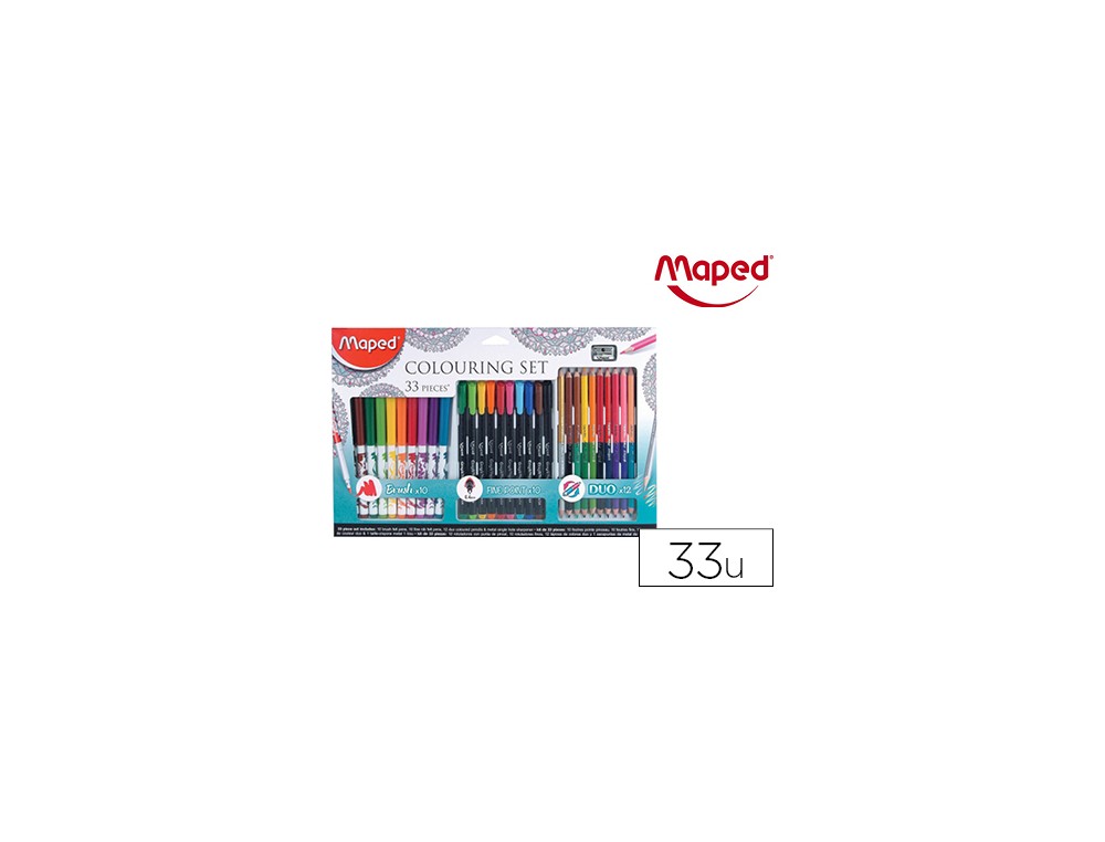 Set de dibujo de 33 piezas. Ideal para colorear mandalas. El set. Contiene: - 10 rotuladores Graph´Peps extra fine 0,4 mm. - 10 rotuladores Color´Peps. - 12 lápices de colorear Duo y un sacapuntas de metal.