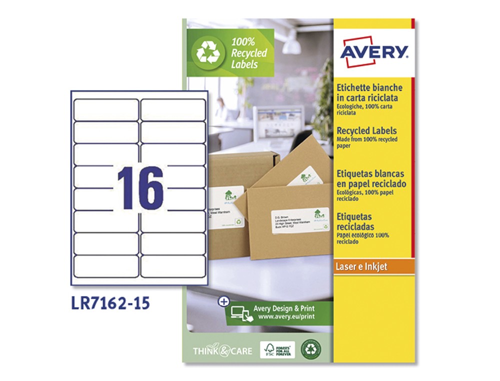 Etiquetas adhesiva blancas Avery en papel blanco, ecológicas realizada en papel reciclado al 100% y certificado FSC. El color blanco es muy parecidoa las etiquetas tradicionales. Adhesivo permanente. Nueva tecnología ultr agrip, agarre seguro sin atascamientos para impresiones perfectas. Cuenta la tecnología QuickPeel, simplemente se divide la hoja a lo largo de la perforación para separar las esquinas de las etiquetas, se remueve y se aplica. Para impresoras láser. Utiliza el software crea e imprime gratuito de Avery para realizar el diseño de las etiquetas con pocos clics. Medidas: 99,1x33,9 mm. Caja de 25 hojas A4. 240 etiquetas por caja.