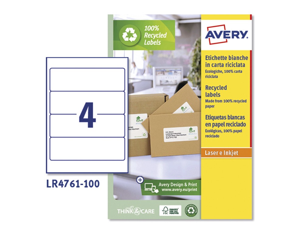 Etiquetas blancas de papel reciclado al 100% con adhesivo permanente. Ideales para etiquetar archivadores de lomo ancho de 6 cm. Nueva tecnología ultragrip, agarre seguro sin atascamientos para impresiones perfectas en Láser, inkjet y fotocopiadora. Hechas de material proveniente de bosque certificado FSC. Caja de 100 hojas. Se puede utilizar el software crea e imprime gratuito de Avery para realizar el diseño de las etiquetas con pocos clics.