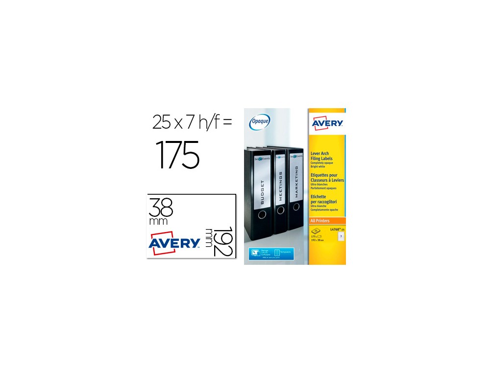 Etiqueta adhesiva avery permanente blanca 38x192 mm para lomo archivador laser caja de 175 unidades