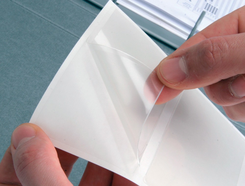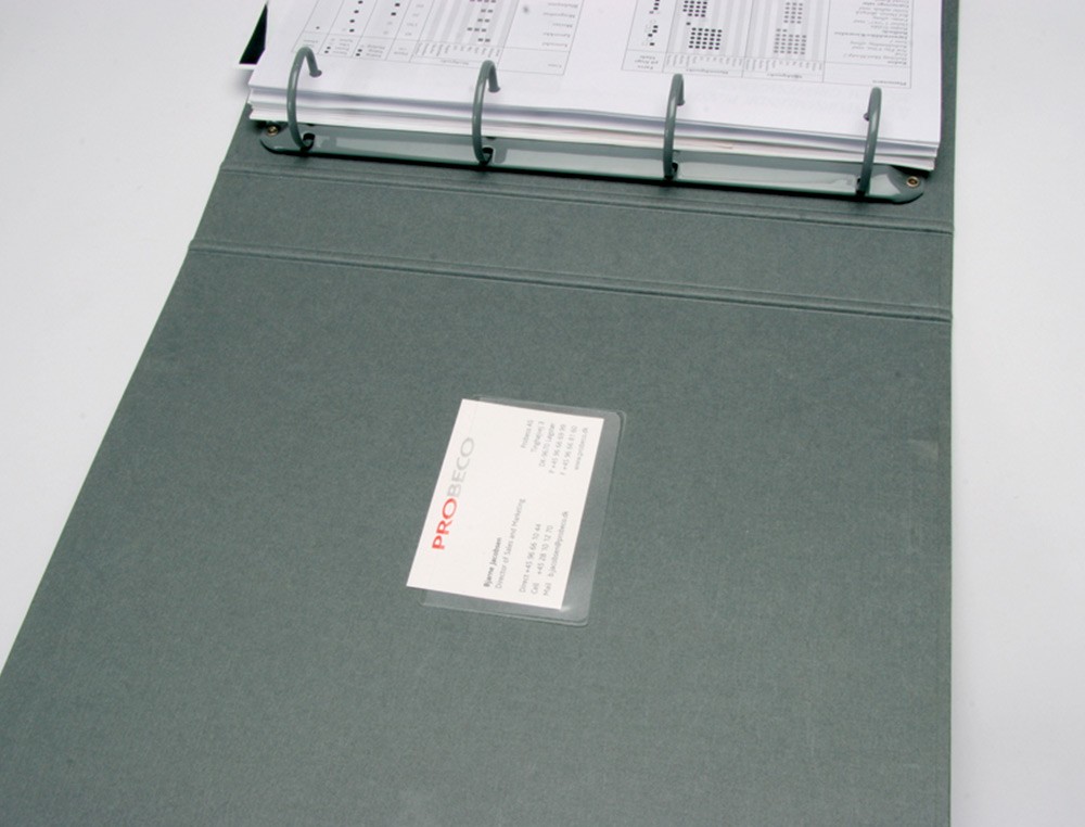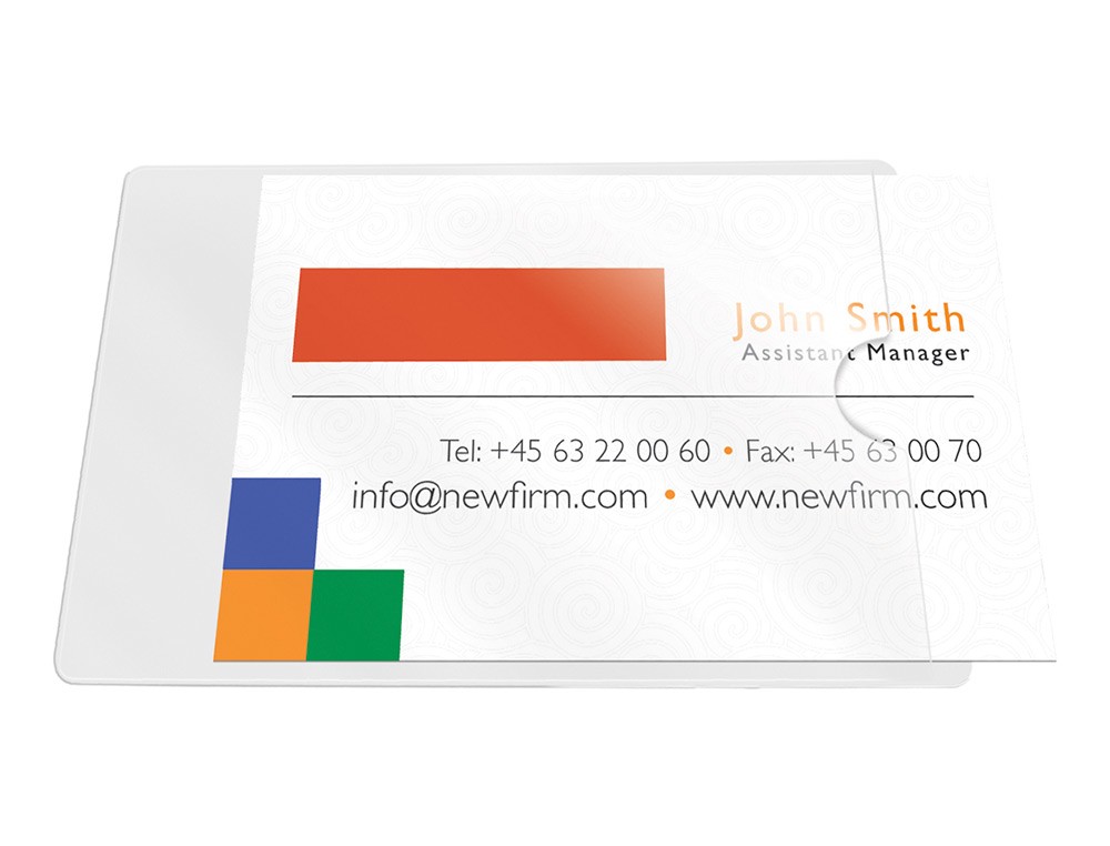 Funda adhesiva para tarjeta de visita. Abertura por la parte más corta. 100 micras. Medidas: 95 x 60 mm. El pack de 10 unidades.