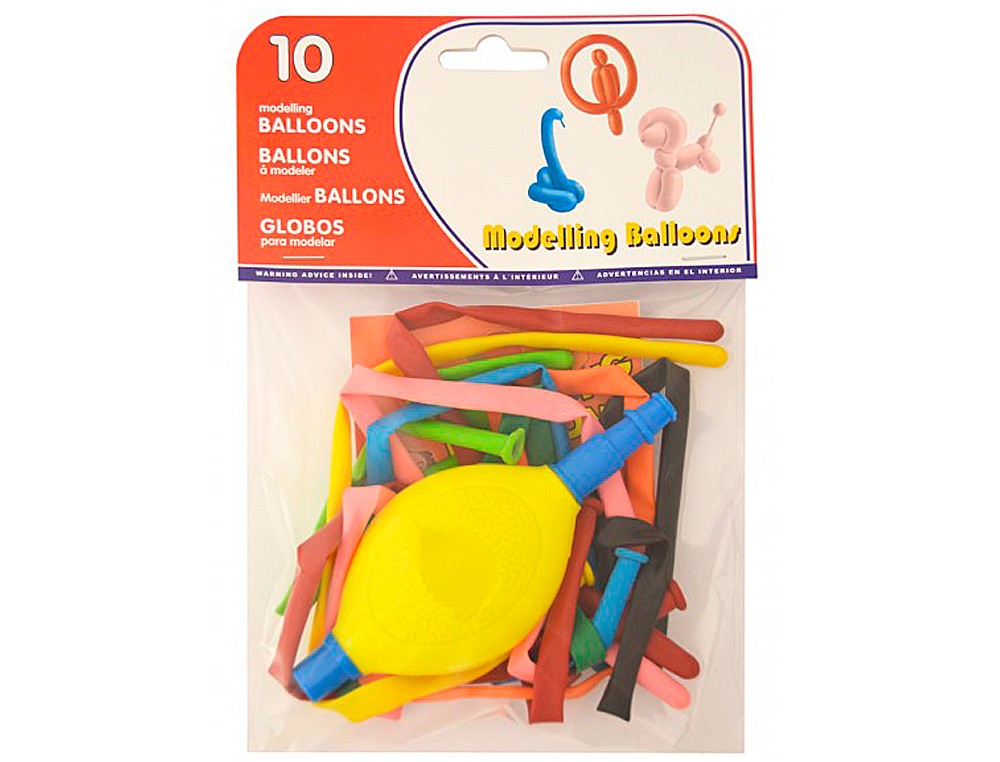 Globos alargados para hacer figuras en diferentes colores. Incorpora un inflador. La bolsa de 10 unidades.