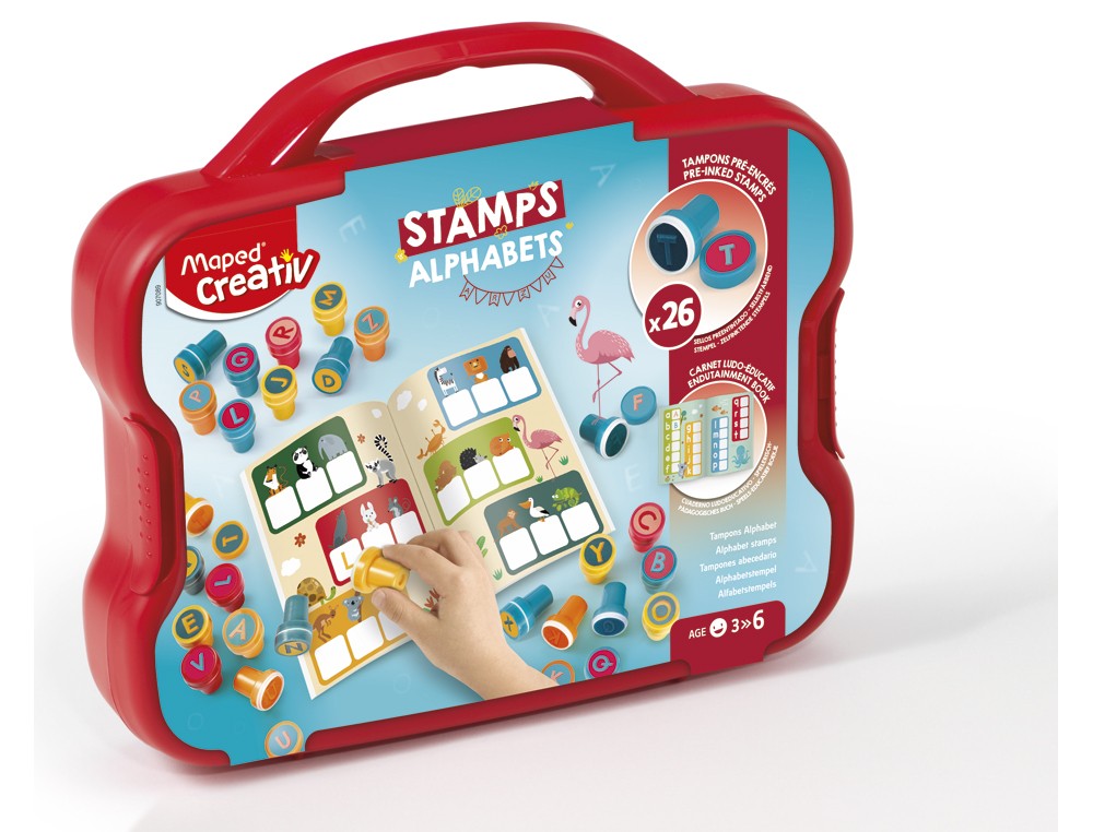 Maletín con 26 sellos de letras y 1 cuaderno para completar. Fácil de usar: sellos preentintados (sin almohadilla de tinta). Pedagógico: 20 páginas con actividades. Tinta lavable.