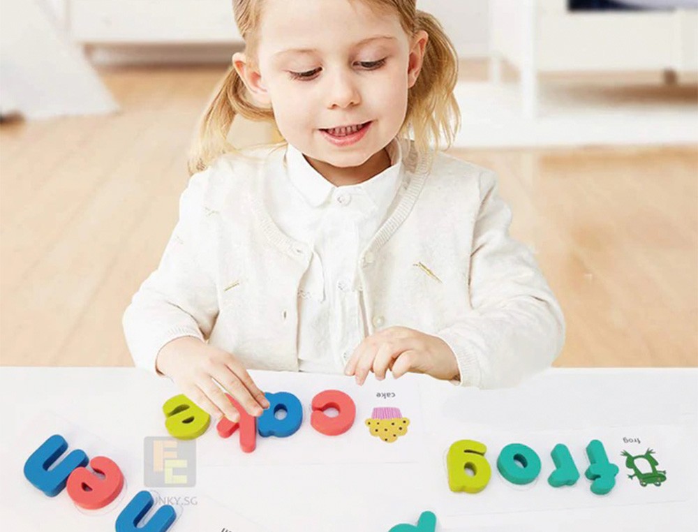 Empareja las letras con las plantillas. Para que los niños se familiariceny aprendan la ortografía en inglés. 26 x 2 letras de madera más 80 palabr as en inglés.