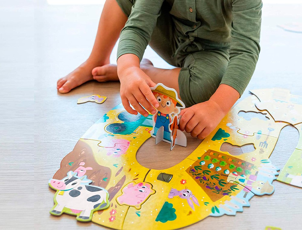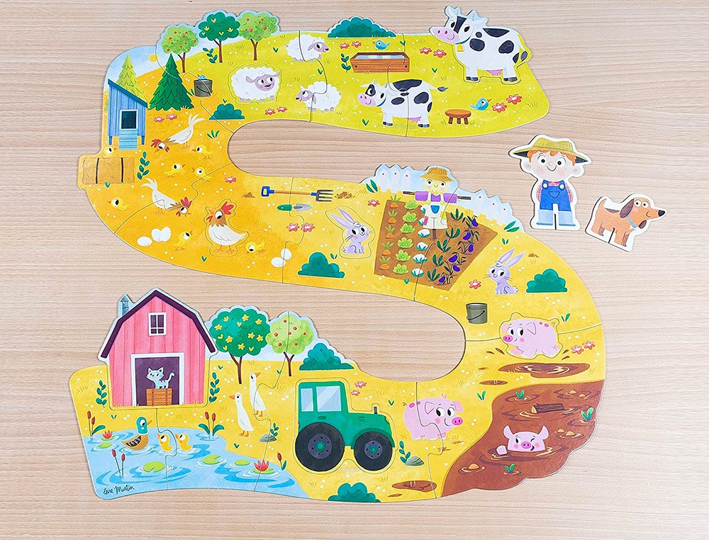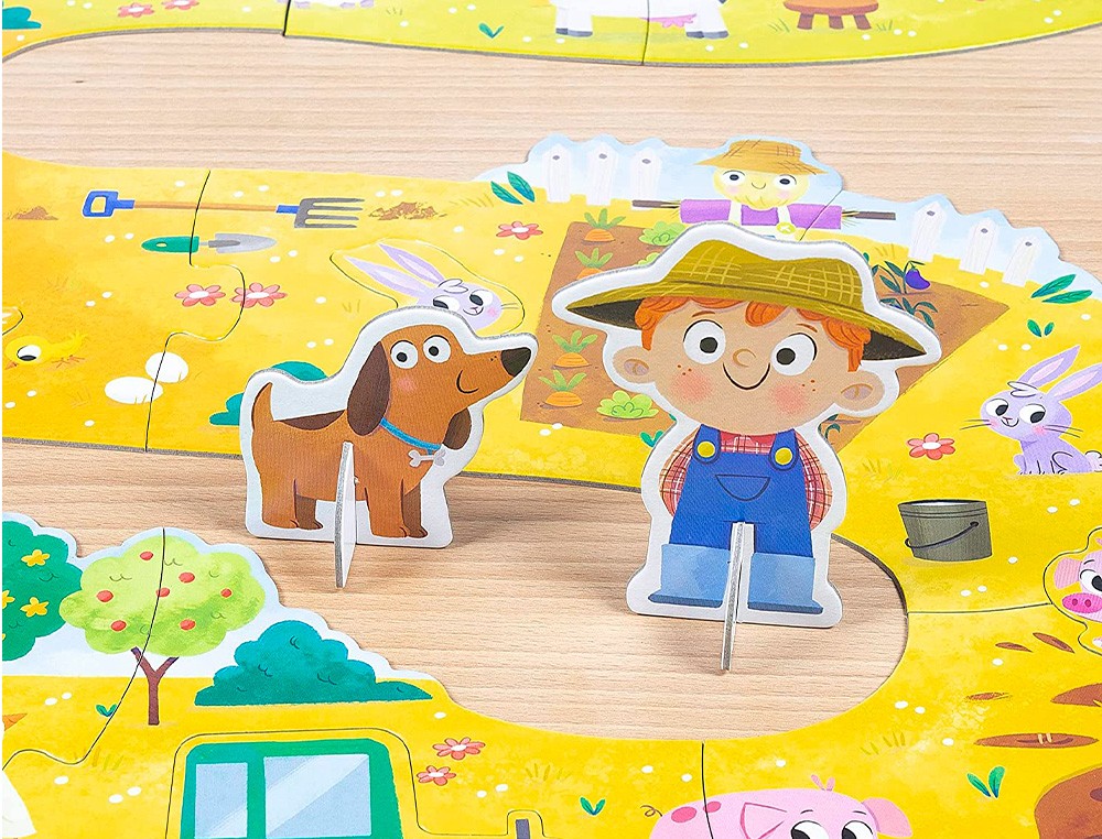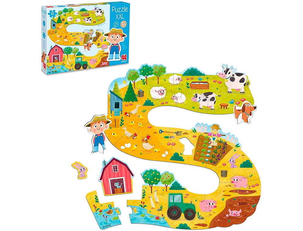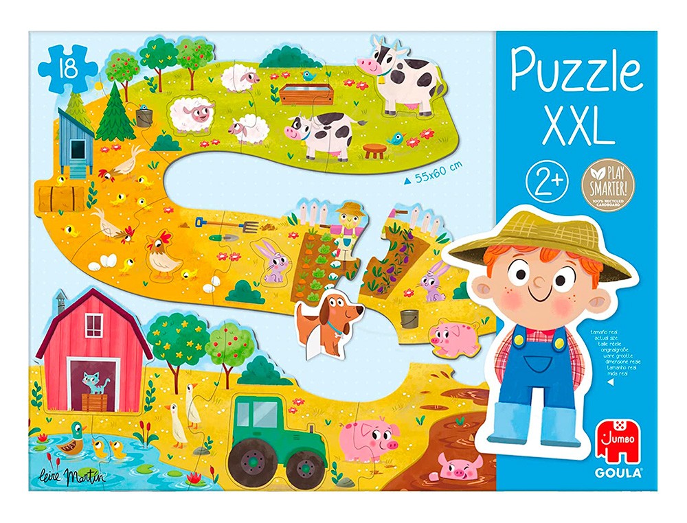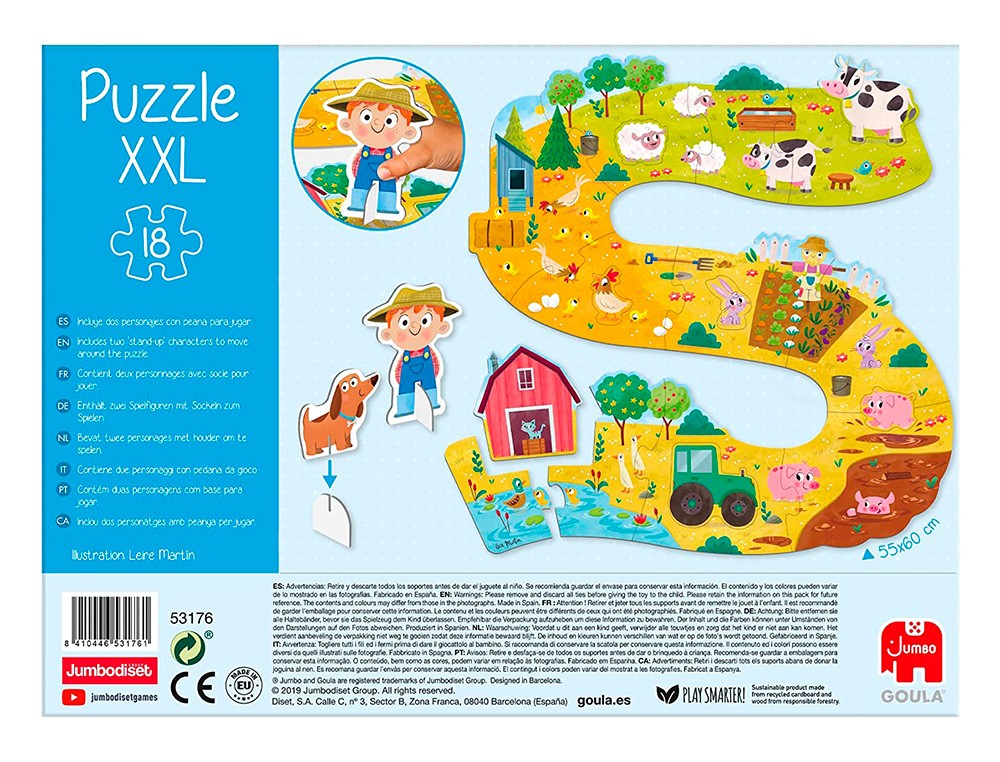 Puzle de cartón con 17 piezas gigantes ambientadas en la granja y dos figuras para poder jugar una vez se haya construido. El puzle conforma una camino serpenteado con distintos elementos que pueden encontrarse en una granja: un huerto, campo con pollitos, con cerditos, vacas y ovejas, un pequeño estanco con patos una granja y un tractor.