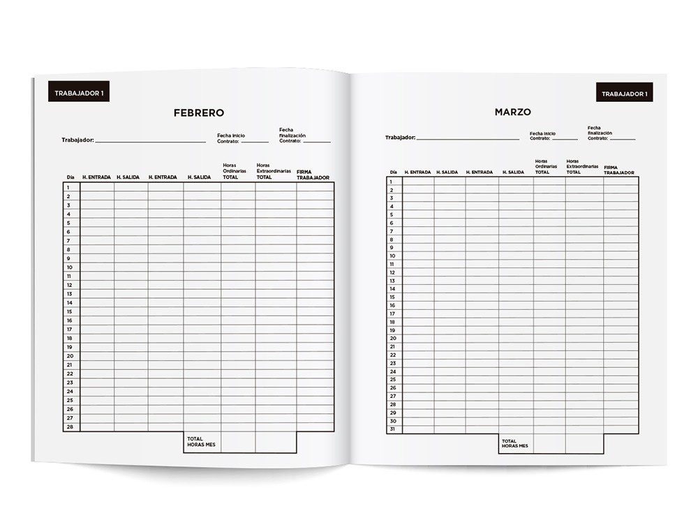 Libro para registro de jornada de empleados. Se pueden registrar hasta 10 trabajadores diferentes para el año completo. 1 mes por página. Ideal para pequeñas empresas y autónomos. Espacio para registro de horas, recuento horas totales ordinarias y extraordinarias y firma del trabajador. 120 hojas. Papel blanco de 90 g/m². Formato DIN A4.