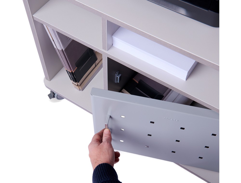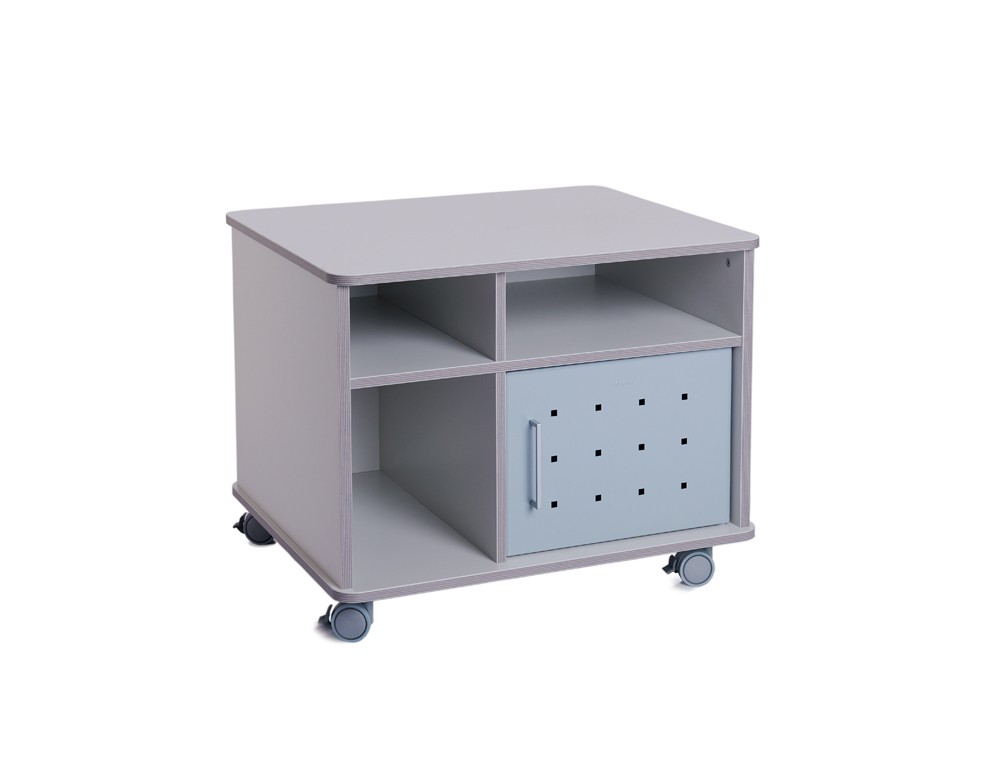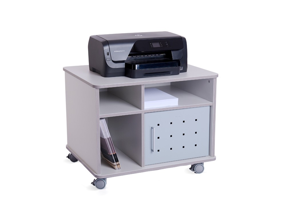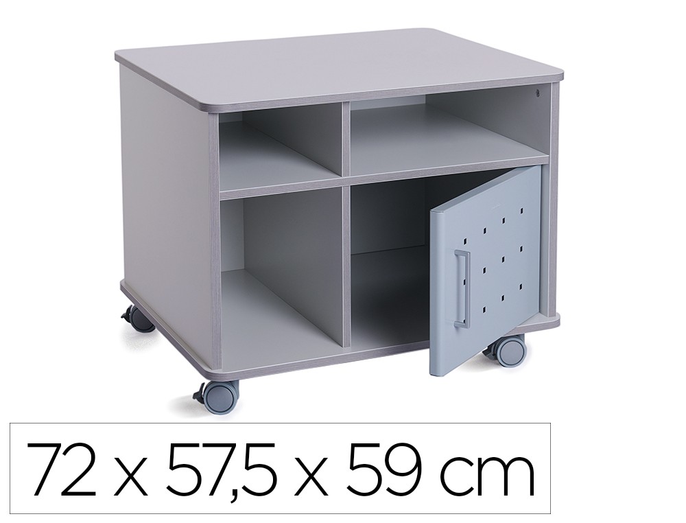 Mesa auxiliar para fotocopiadora y accesorios de gran formato.. Tableros con aristas redondeadas para evitar golpes. Puerta metálica cubierta con pintura de color gris. Fácil montaje. Todo el conjunto está fabricado en melamina de 19 mm de espesor. Capacidad para documentos con formato Din A4 y Din A3. Color gris. Ruedas con sistema de bloqueo de diseño innovador, de alta resistencia. . Medidas: 72 x 59 x 58 cm.