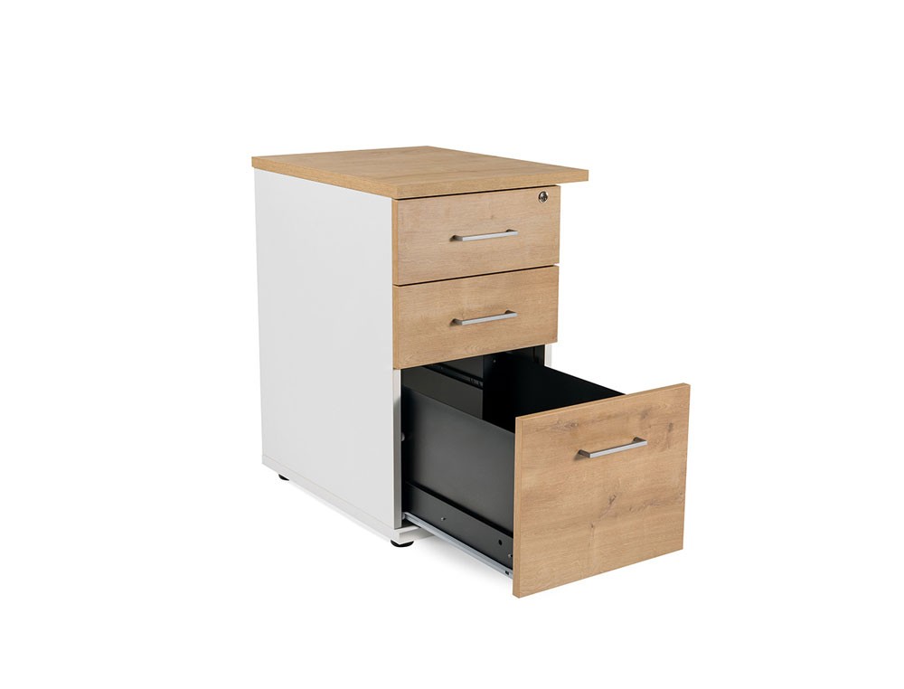 Estructura realizada en melamina de 19 mm en su totalidad, incluido trasera. Las 4 ruedas disponen de sistema de freno para la correcta fijación. Cerradura con 2 llaves plegables. Sistema de cierre centralizado para la confidencialidad deseada. Sistema antivuelco incorporado para una máxima seguridad. Tiradores metálicos con acabado metalizado. Cajones metálicos realizados en chapa de acero. Guías metálicas con rodamientos de Nylon.