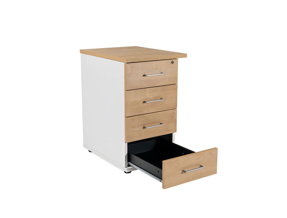 Estructura realizada en melamina de 19 mm en su totalidad, incluido trasera. Las 4 ruedas disponen de sistema de freno para la correcta fijación. Cerradura con 2 llaves plegables. Sistema de cierre centralizado para la confidencialidad deseada. Sistema antivuelco incorporado para una máxima seguridad. Tiradores metálicos con acabado metalizado. Cajones metálicos realizados en chapa de acero. Guías metálicas con rodamientos de Nylon.