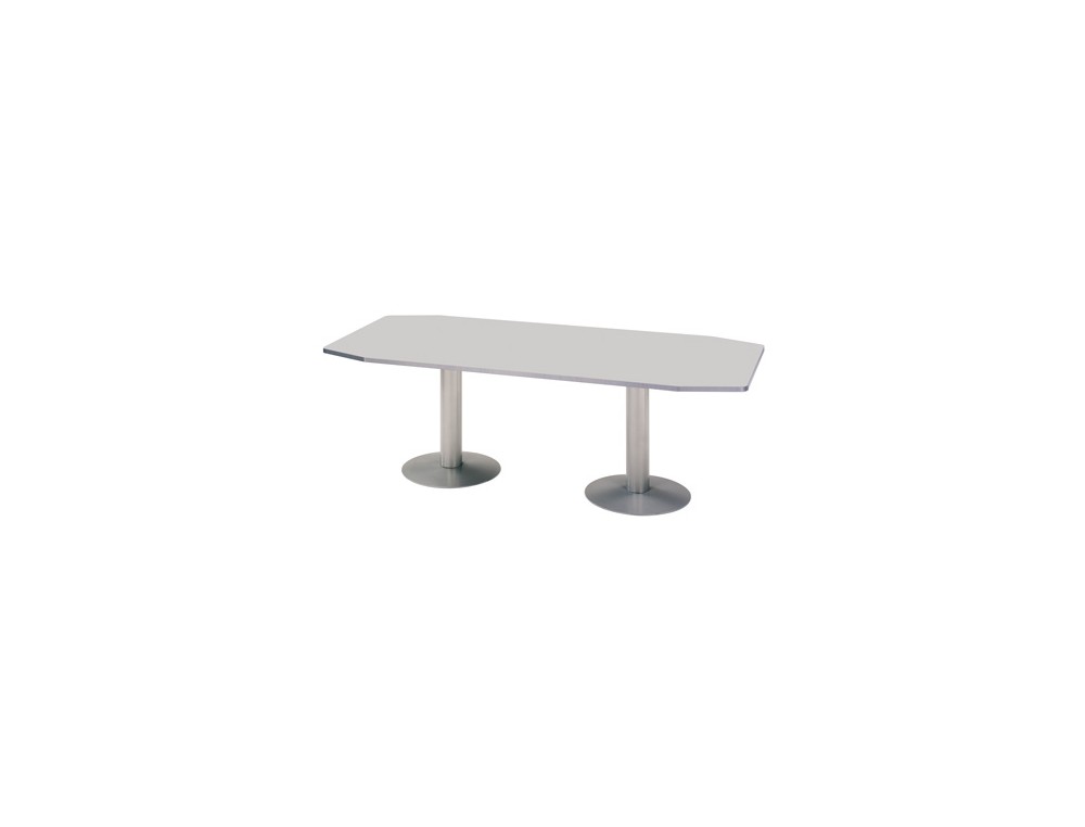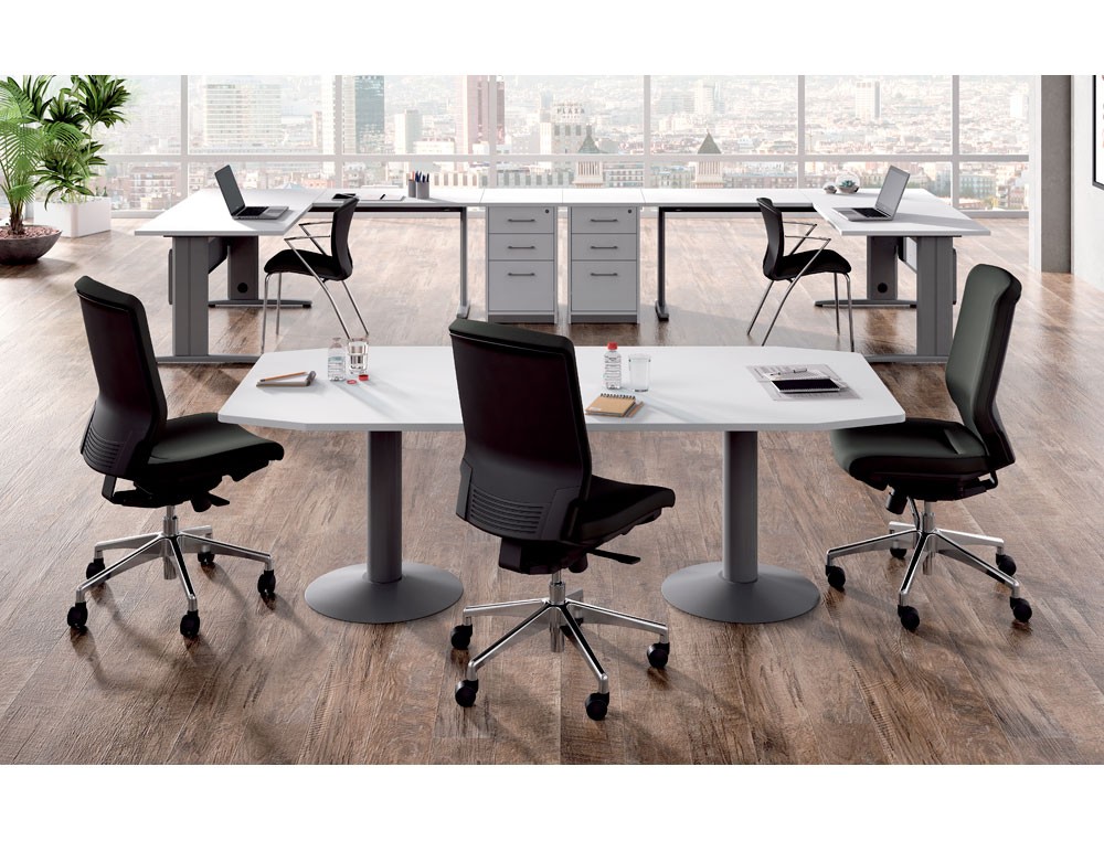 Mesa de reunión con estructura de melamina o acero de generosas dimensiones ideal para reunirse con varios integrantes en una sola mesa. Compuesta de pies realizados en melamina de 25 mm de grosor con regulación independiente de 2 cm, o cilíndricos en formato columna realizado en plancha metálica pintada epoxy, color según modelo. Tablero de melamina de 25 mm de grosor, color según modelo, con canto de 1 mm de grosor del mismo color. Disponible en color haya, gris o blanco.